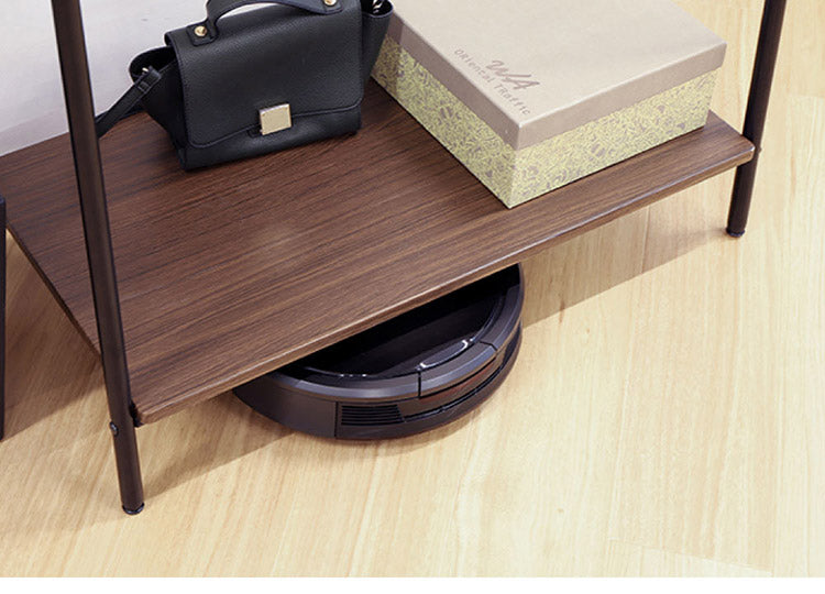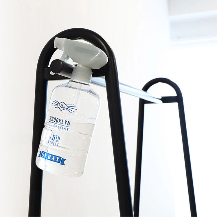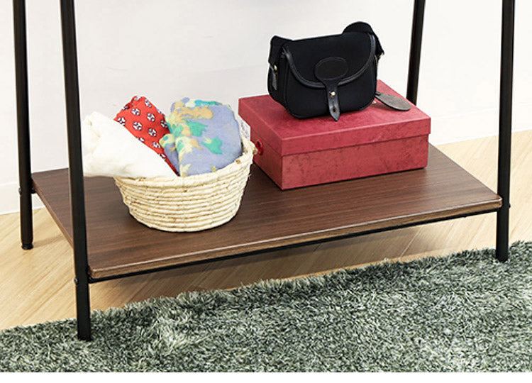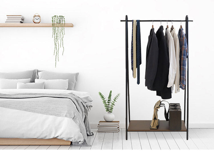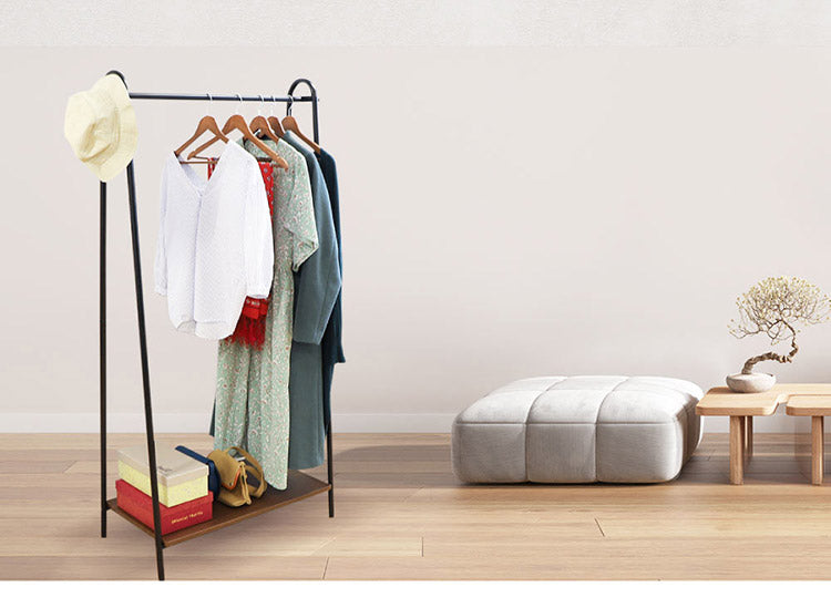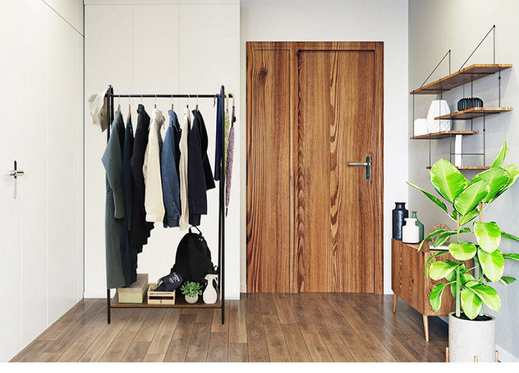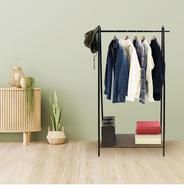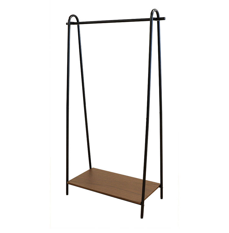 マットブラックフレームに木目が映える、シンプルモダンなデザインのパイプハンガー。