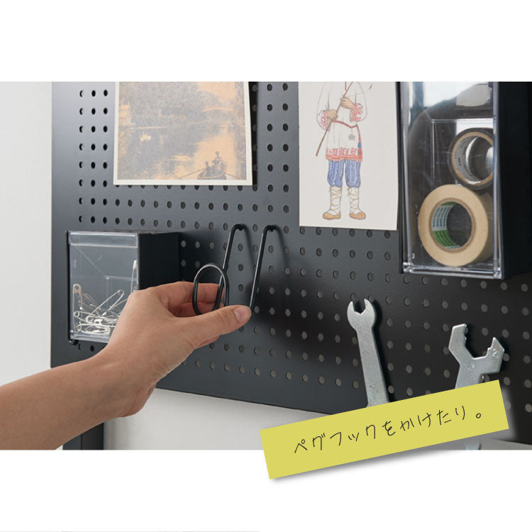 ・有孔ボードなので、フックなどを使って引っ掛け収納もできます。