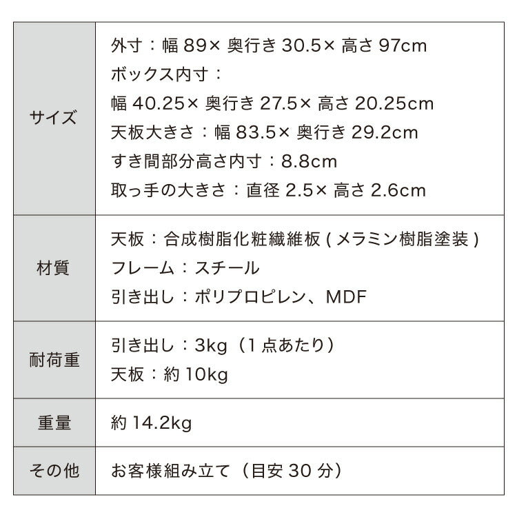 天板:合成樹脂化粧繊維板(メラミン樹脂塗装)