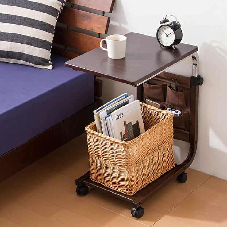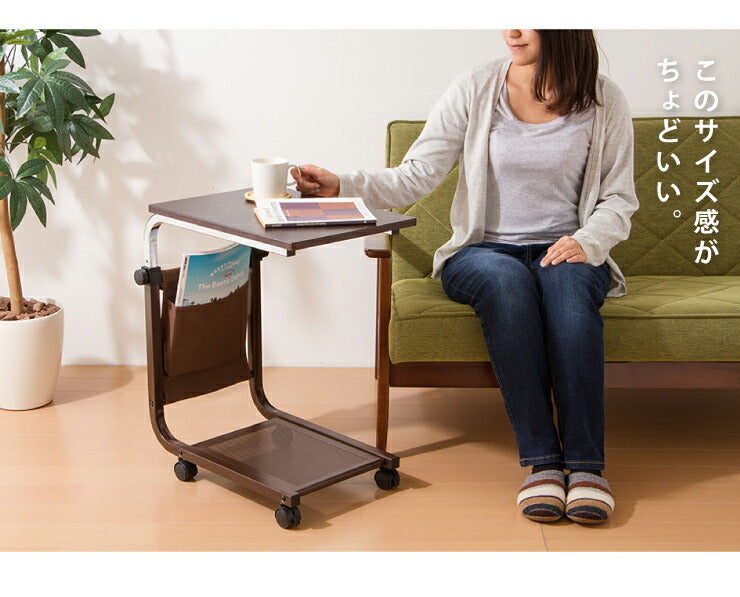 昇降式サイドテーブル コンパクト 幅36cm 奥行52cm 高さ63-80cm 木製 昇降式 高さ調節 キャスター付 ポケット付 シンプル ベッドテーブル ナイトテーブル 伸縮式テーブル 作業用 ベッドサイド 収納付き