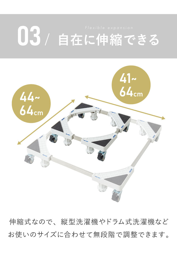 洗濯機スライド台 キャスター付き 水平器付き 伸縮式 耐荷重300kg ランドリー 可動 無段階調整 ストッパー付き 洗濯機ラック 排水パン 洗濯機パン スライド台