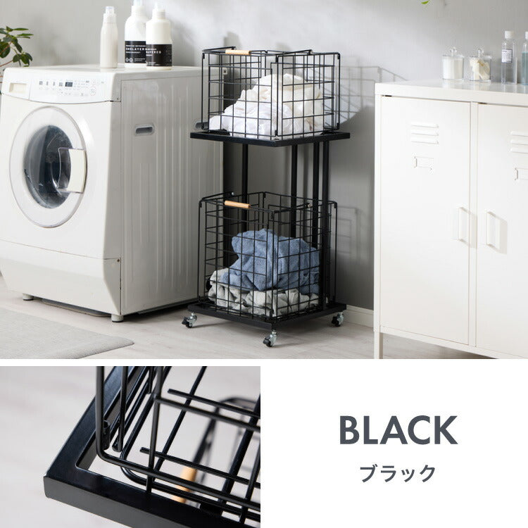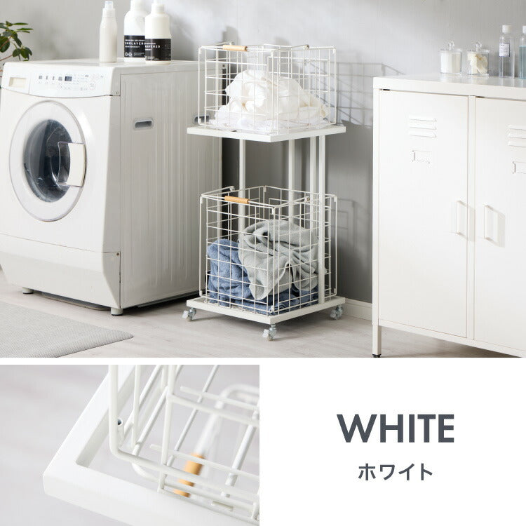 ランドリーバスケット 2段 木取っ手 角型 ランドリーワゴン 洗濯かご キャスター付き スリム スクエアタイプ ランドリーラック ランドリーボックス ワイヤーバスケット バスケット ランドリー収納
