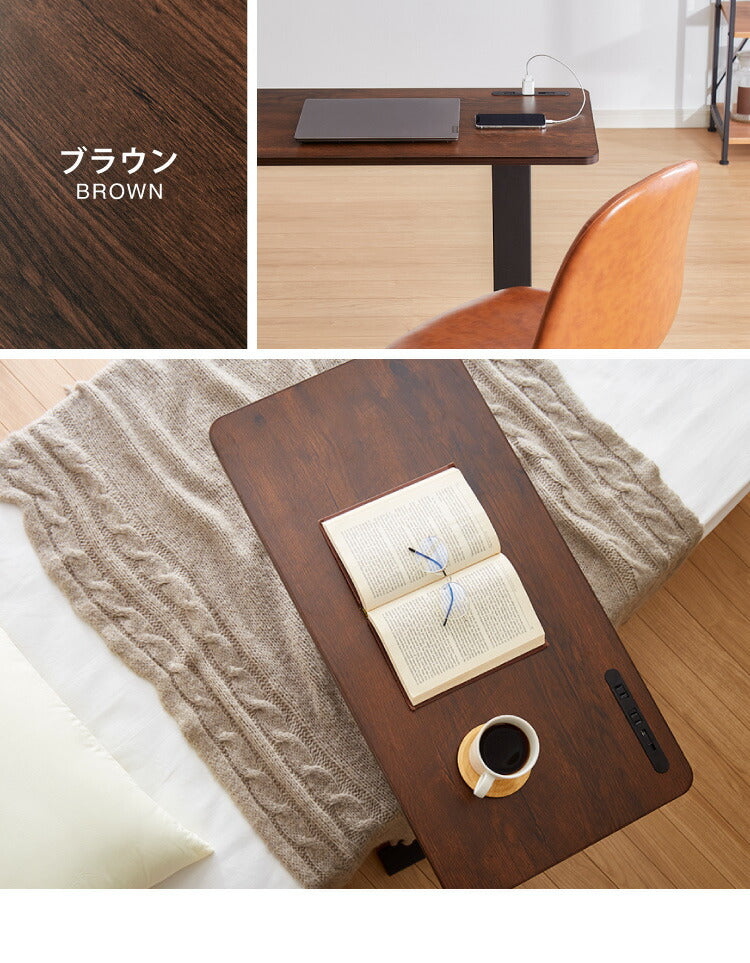 昇降式テーブル ガス圧 無段階 高さ調節 レバー式 80×40 キャスター コンセント USBポート ブラウン ナチュラル 大理石調 テレワーク 在宅 介護 ベッドサイド テーブル 昇降テーブル サイドテーブル