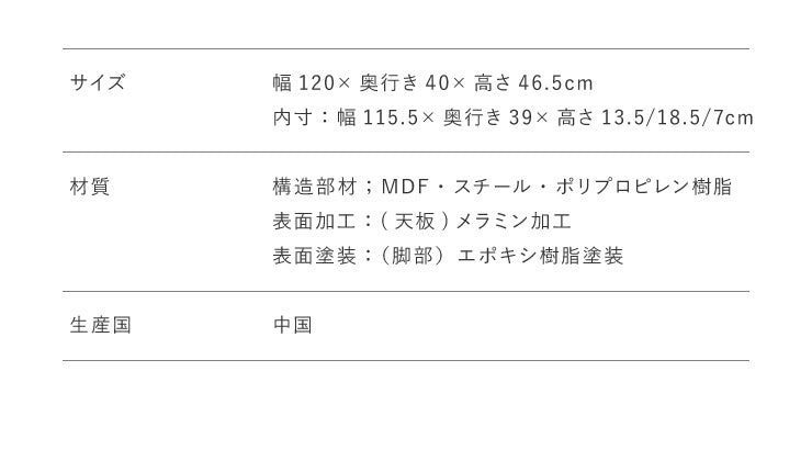 内寸:幅115.5×奥行き39×高さ13.5/18.5/7cm