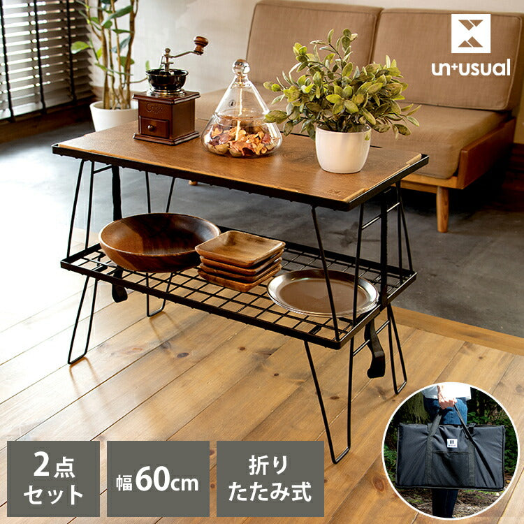 アウトドア マルチラック2点セット UN+USUAL アニュージュアル フォールディングマルチラック 天板付き 折りたたみ可能 アウトドアテーブル 折りたたみ 棚 ローテーブル スチール キャンプ