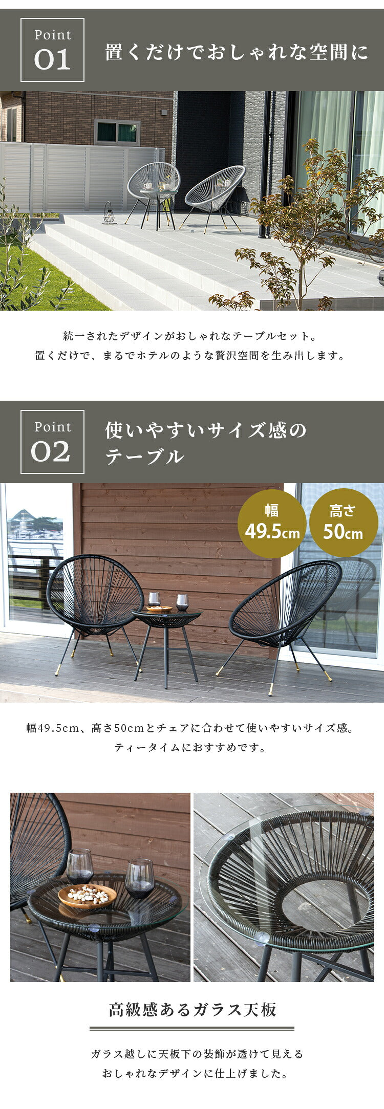 ・包み込まれるような座り心地でリラックスできる、あるだけでホテルライクなガーデン&テーブル3点セットです。