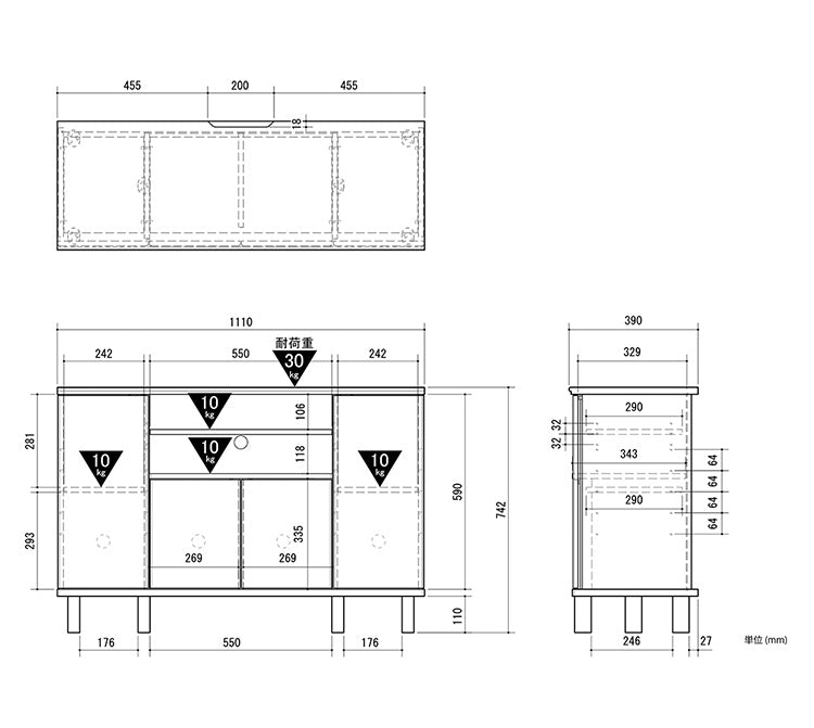可動棚(中央部)×1枚(約幅55×奥行29×高さ1.5cm)、可動棚(左右)×2枚(約幅24.2×奥行29×高さ1.5cm)