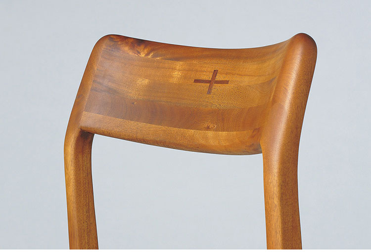 「北欧の温もりを日本の暮らしに」50,60年代の北欧ビンテージ家具の復刻板。シンプルデザイン(曲線にて優しい)、ハンドメイド性(小ロッドにてこだわりのある製品作り)。背板の中央部に十字のインレイをはめ込みアイキャッチにしてます。