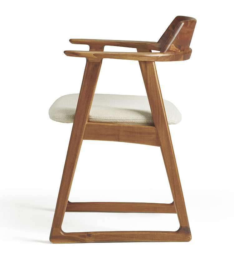 「北欧の温もりを日本の暮らしに」50,60年代の北欧ビンテージ家具の復刻板。シンプルデザイン(曲線にて優しい)、ハンドメイド性(小ロッドにてこだわりのある製品作り)。背板上部の中央部に十字のインレイをはめ込みアイキャッチにしてます。座面ファブリックはマジックテープで取り外してドライクリーニングが可能です。