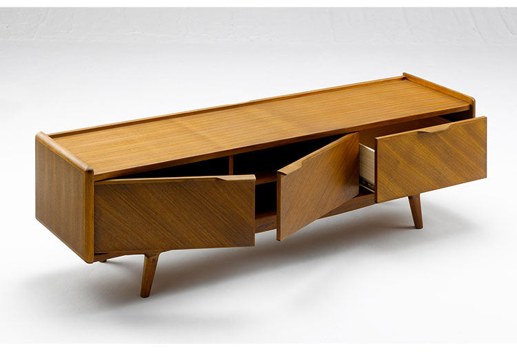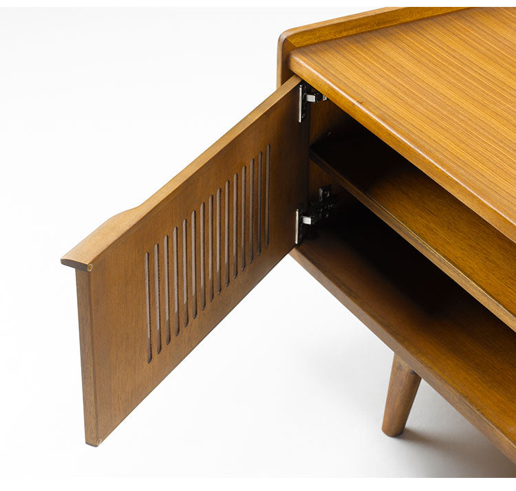 向かって右の戸は引き出し、中央と左は観音開きの開き戸になっていて、閉まったままでも内側がアクリル板仕様になっている為、リモコンが通ります。