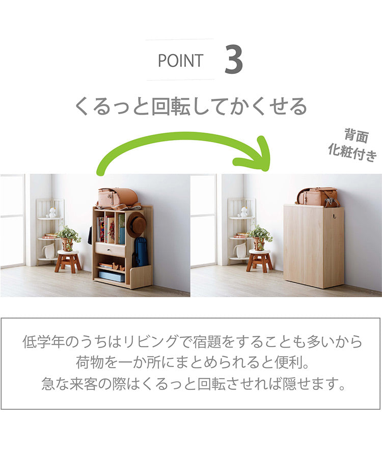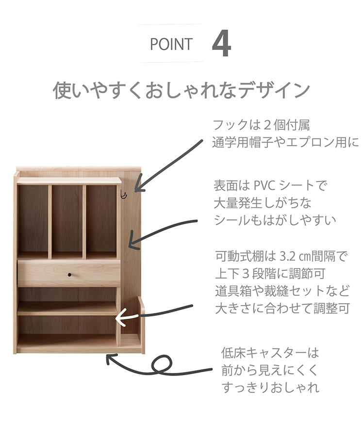 本棚部には教科書など、引き出し部には筆記用具などが収納可能です。