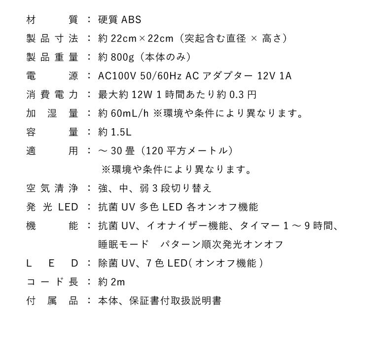 ■機能:抗菌UV、イオナイザー機能、タイマー1~9時間、睡眠モード パターン順次発光オンオフ
