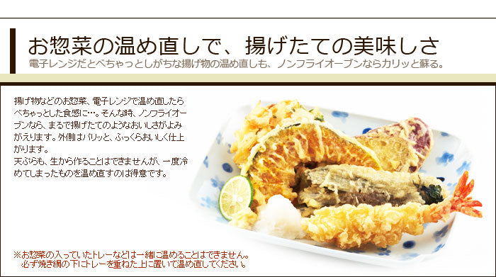 ※お惣菜の入っていたトレーなどは一緒に温めることはできません。必ず焼き網の下にノンフライオーブントレーを重ねた上に置いて温め直してください。