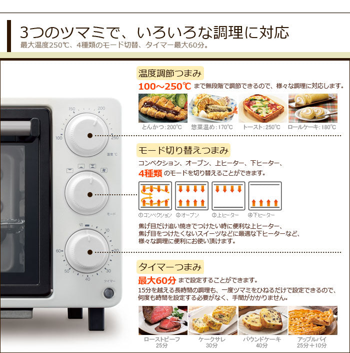 ノンフライオーブン(コンベクションオーブン)、上下ヒーター、上ヒーターのみ、下ヒーターのみが選べるので、お好みのオーブン料理やトーストが作れます。