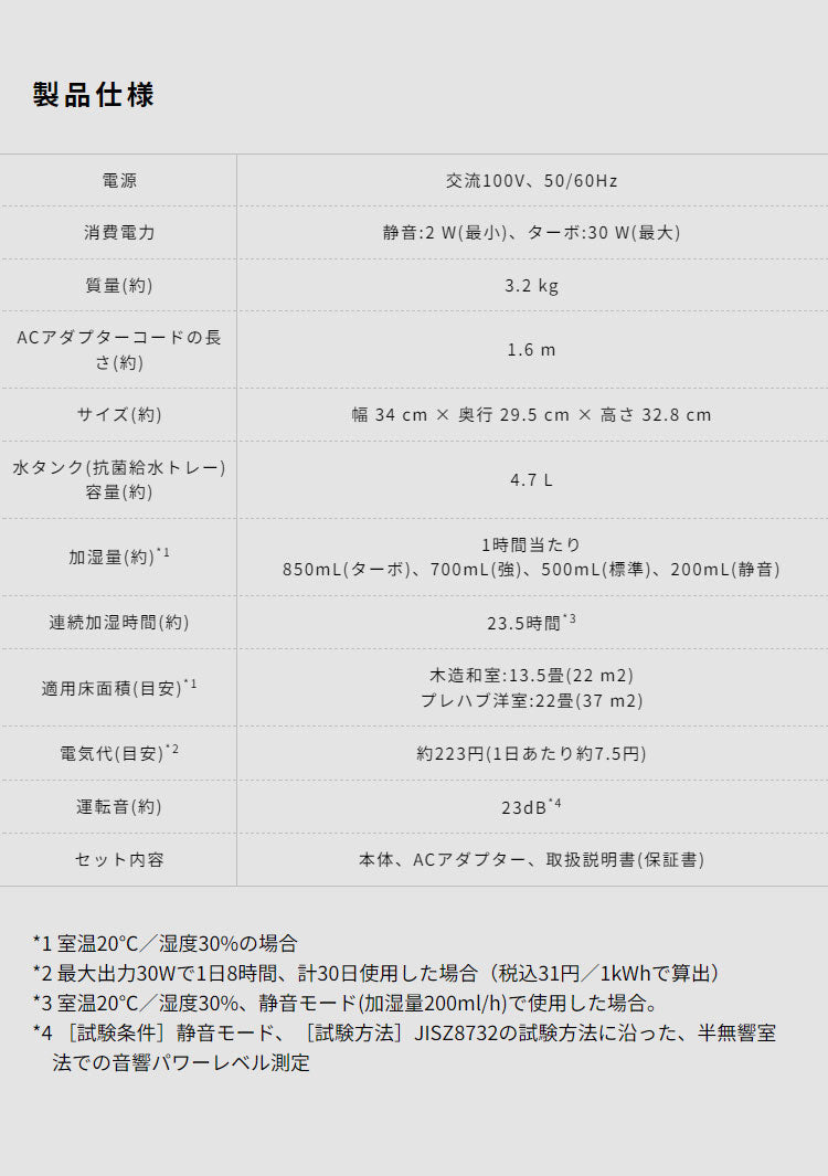 加湿量(約)*1:1時間当たり/850mL(ターボ)、700mL(強)、500mL(標準)、200mL(静音)