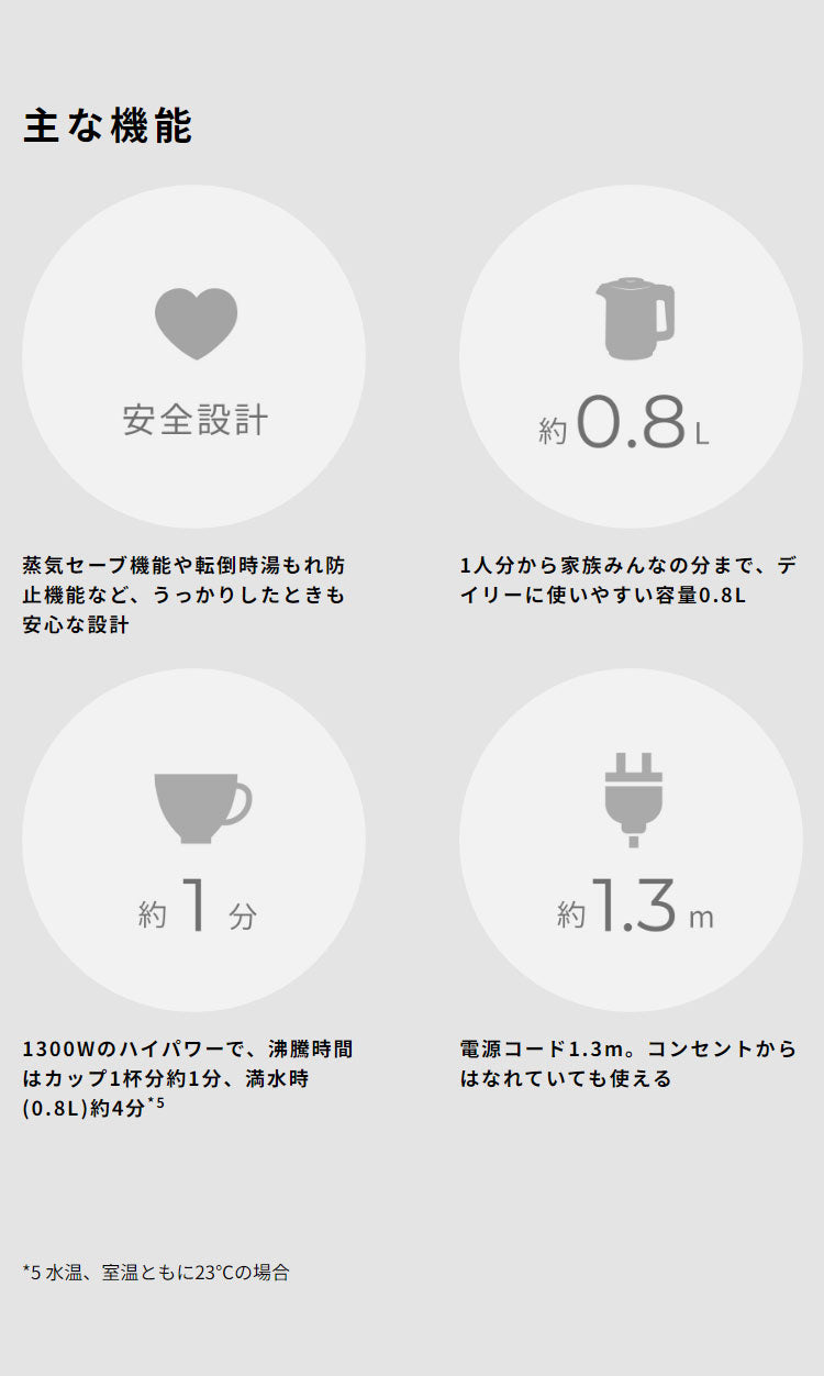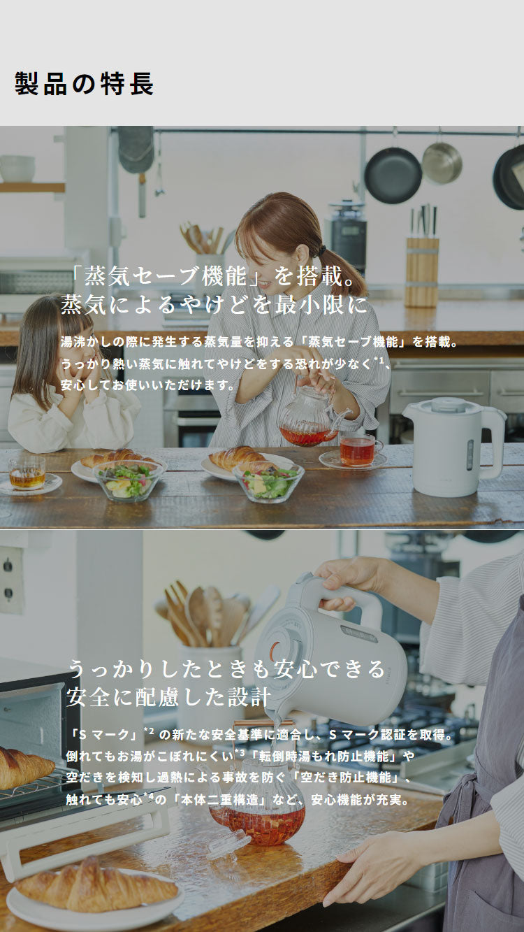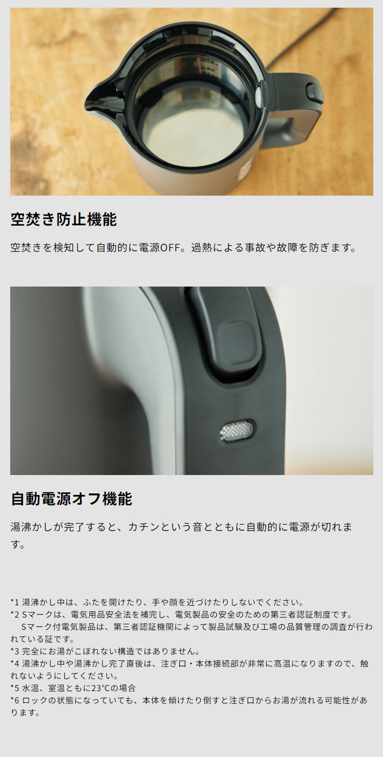 湯沸かし時にも本体表面が熱くなりにくい「本体二重構造」や、万が一倒れても湯こぼれを抑える「給湯ロックボタン」、空だきを検知して過熱による事故や故障を防ぐ「空だき防止機能」、沸騰したら自動的に電源を切る「自動電源オフ」といった安全面に配慮した設計で、日々安心してお使いいただけます。