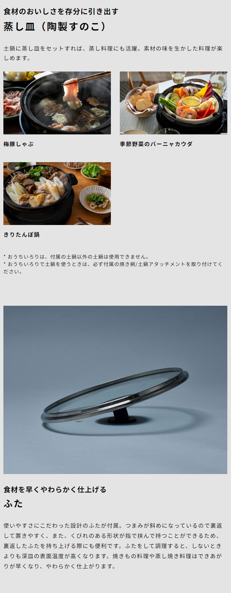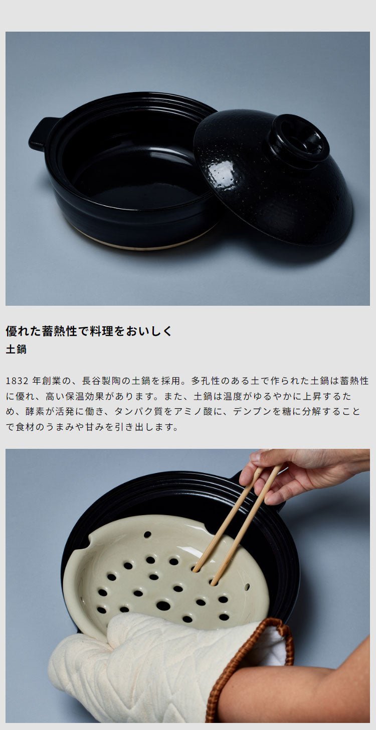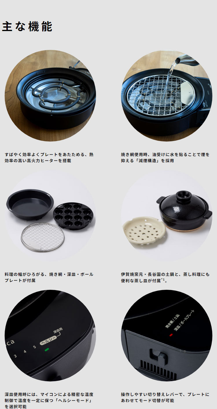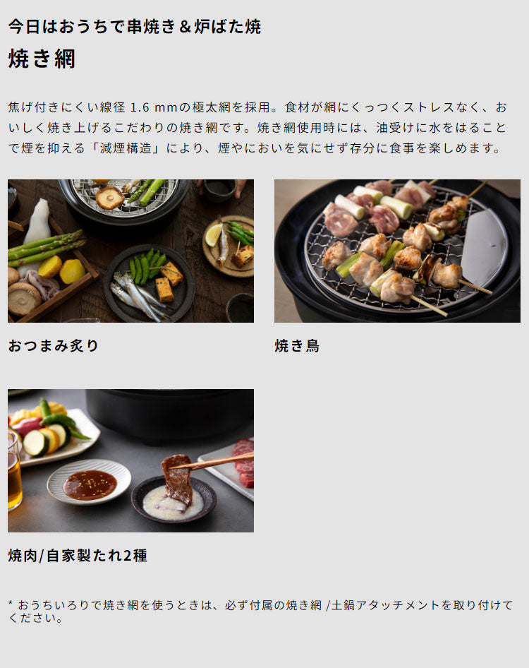 ■ 付属品:焼き網、深皿(蓋付)、ボールプレート、取っ手、焼き網/土鍋アタッチメント、レシピブック