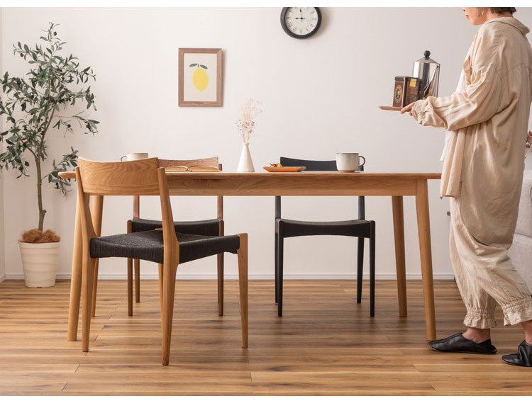 ●黒のスタイリッシュな座面とナチュラルな木目の脚が、温かさとメリハリのある空間を演出。