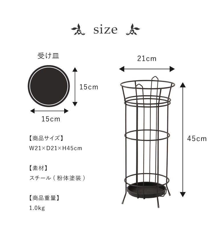 スチールを使用した、圧迫感のない開放的な傘立て。コンパクトなサイズ感で、玄関先に置いても邪魔になりません。どんな家にも合うシンプルなデザインとカラーを用意しました。