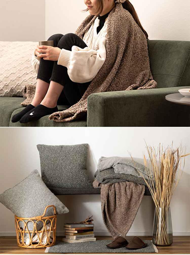 ベッド横や玄関先で使いやすいサイズ感のマット、置くだけでお部屋のアクセントとしても活躍してくれるクッション、大判サイズでゆったりと使えるスローケットの3アイテムをご用意しました。