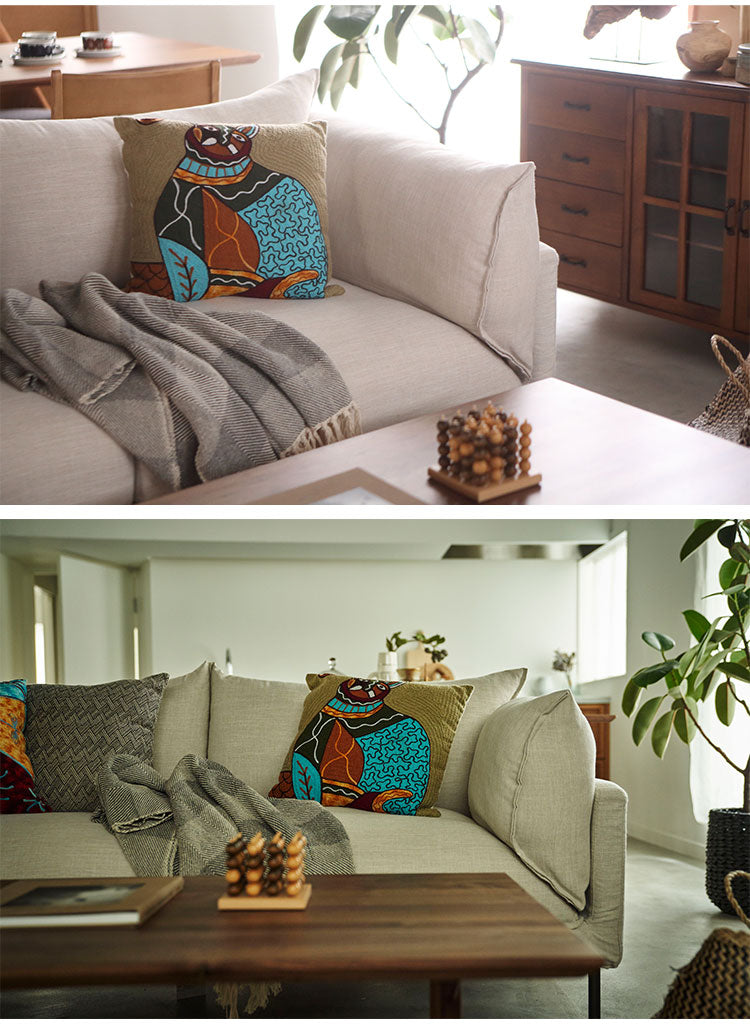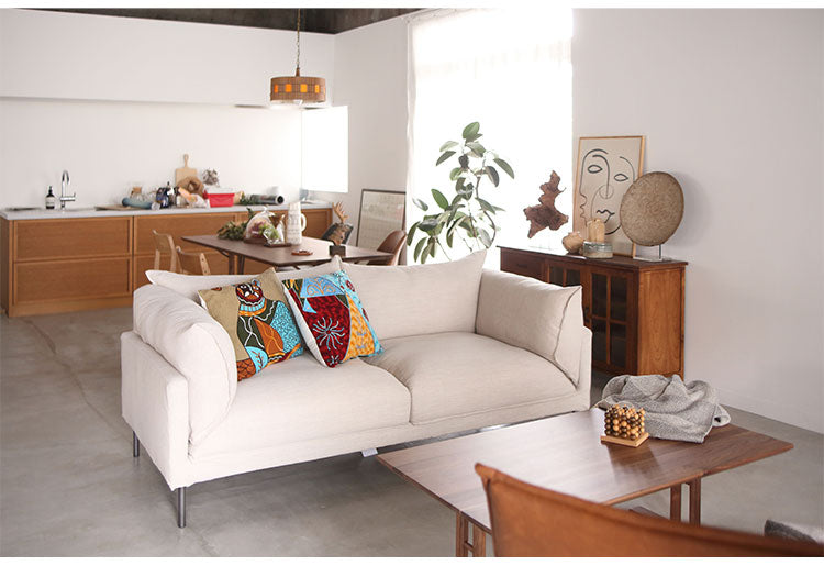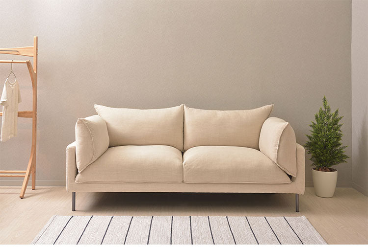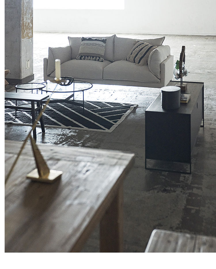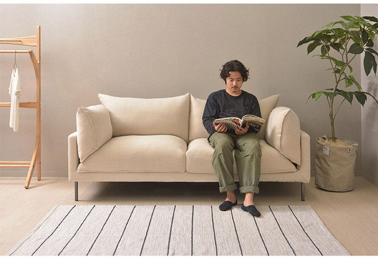 細いスチール脚と重厚感のあるクッションのバランスが魅力的なモダンデザインのソファです。ボリュームのあるクッションが体全体を優しく包み込みます。