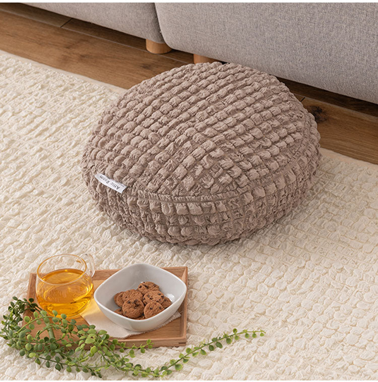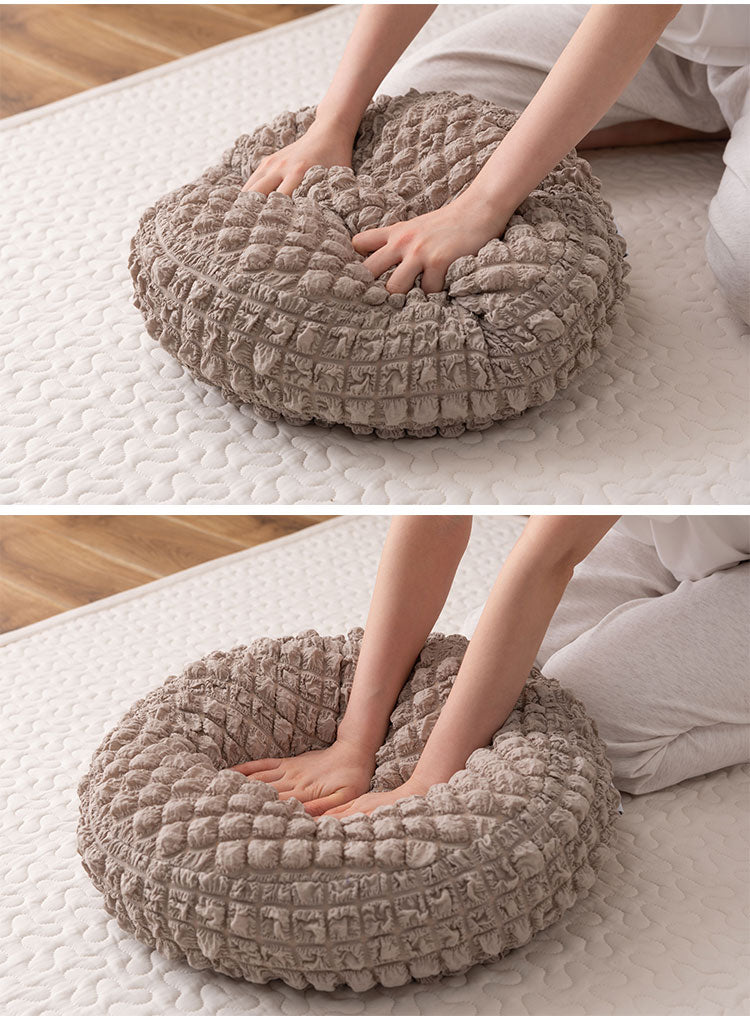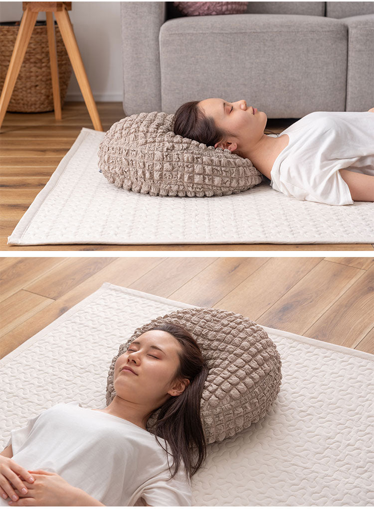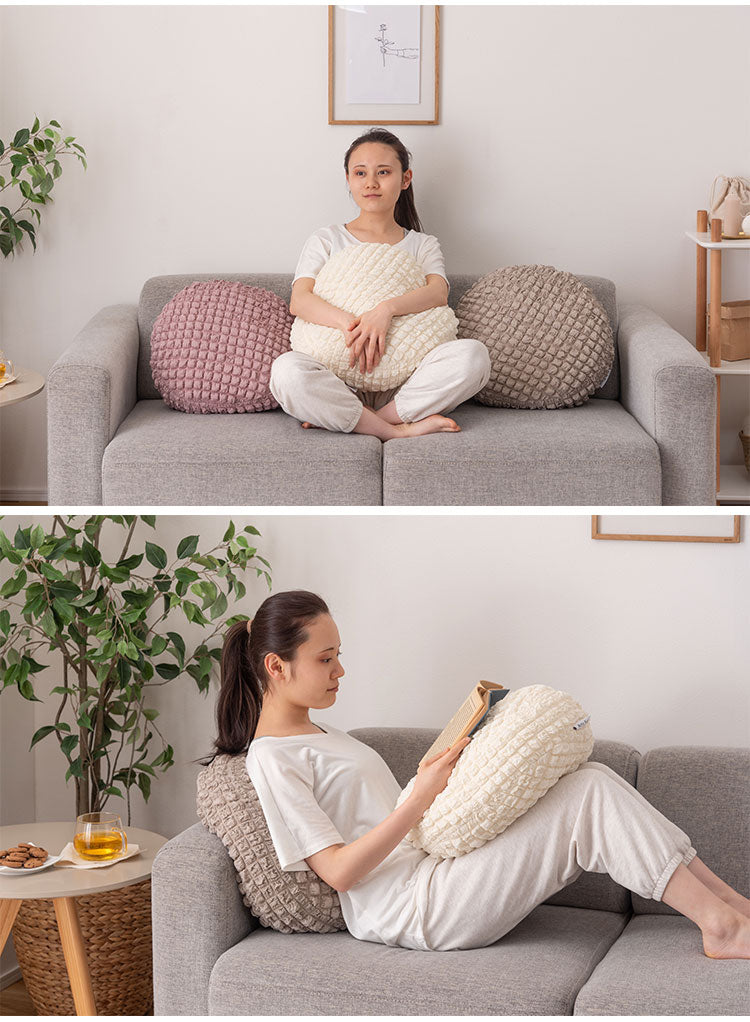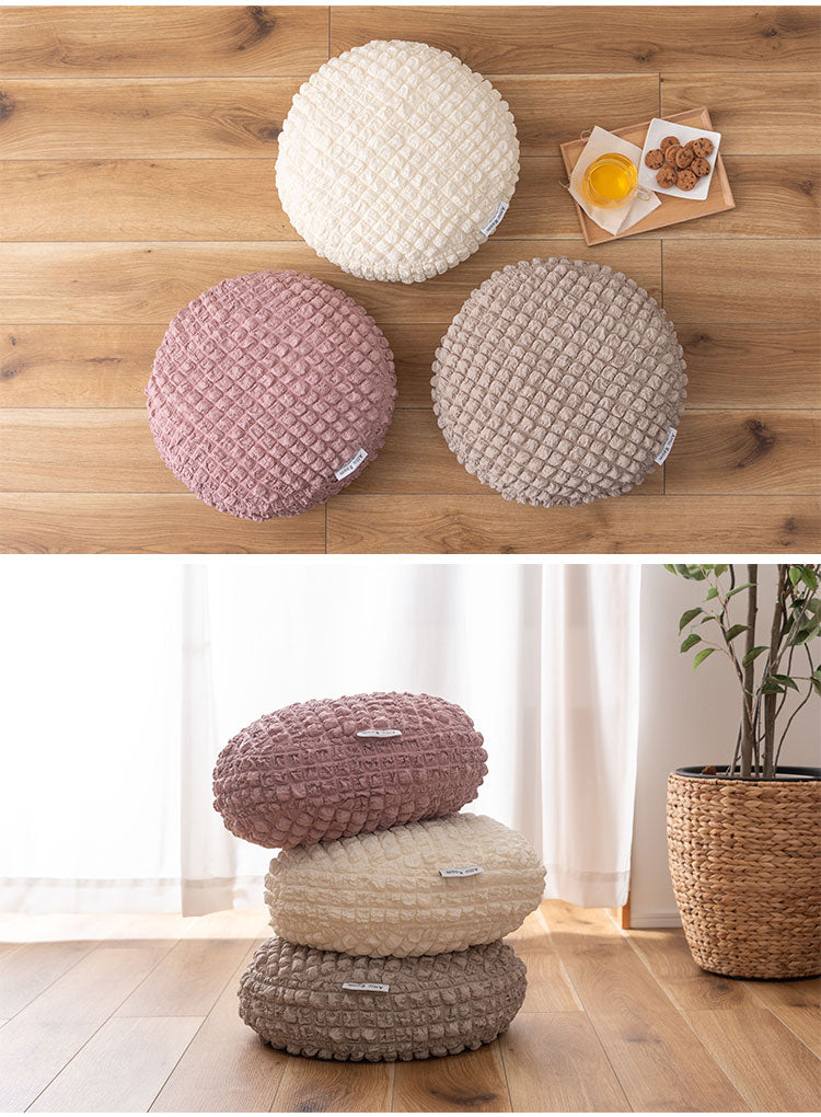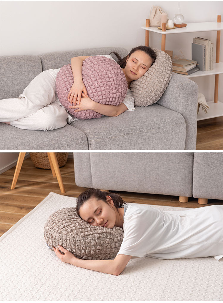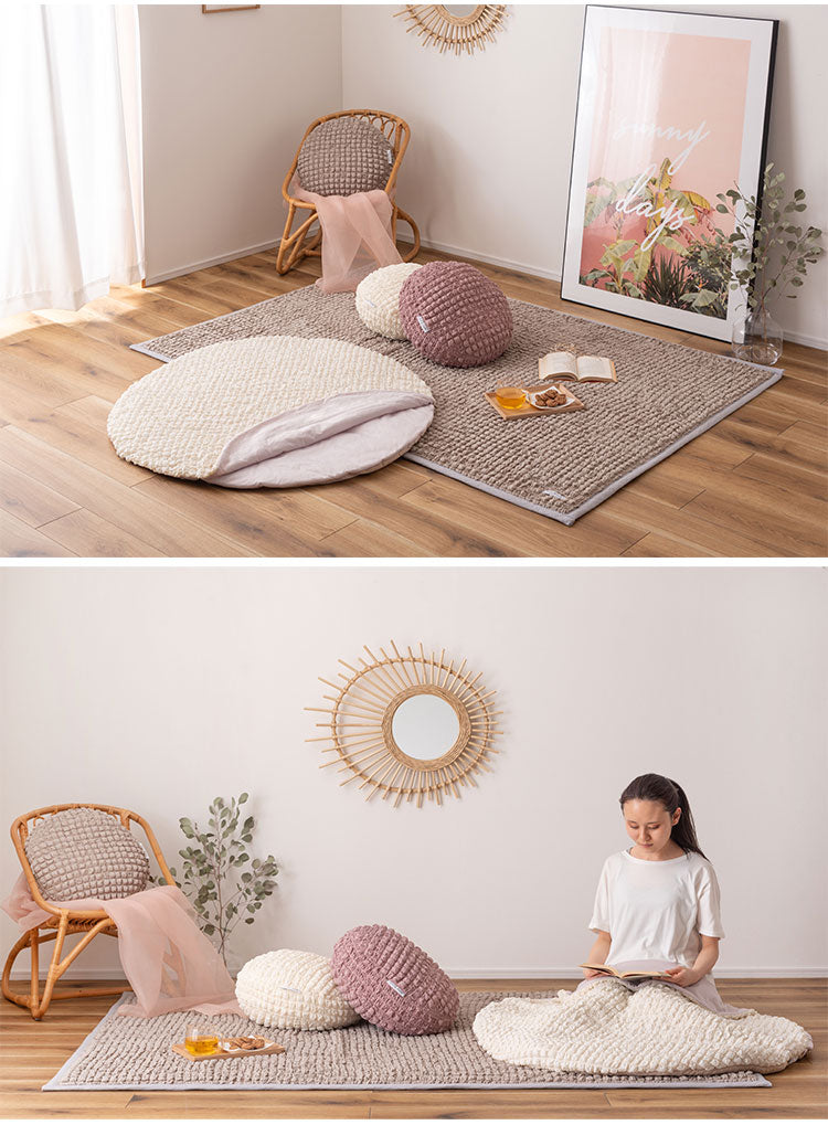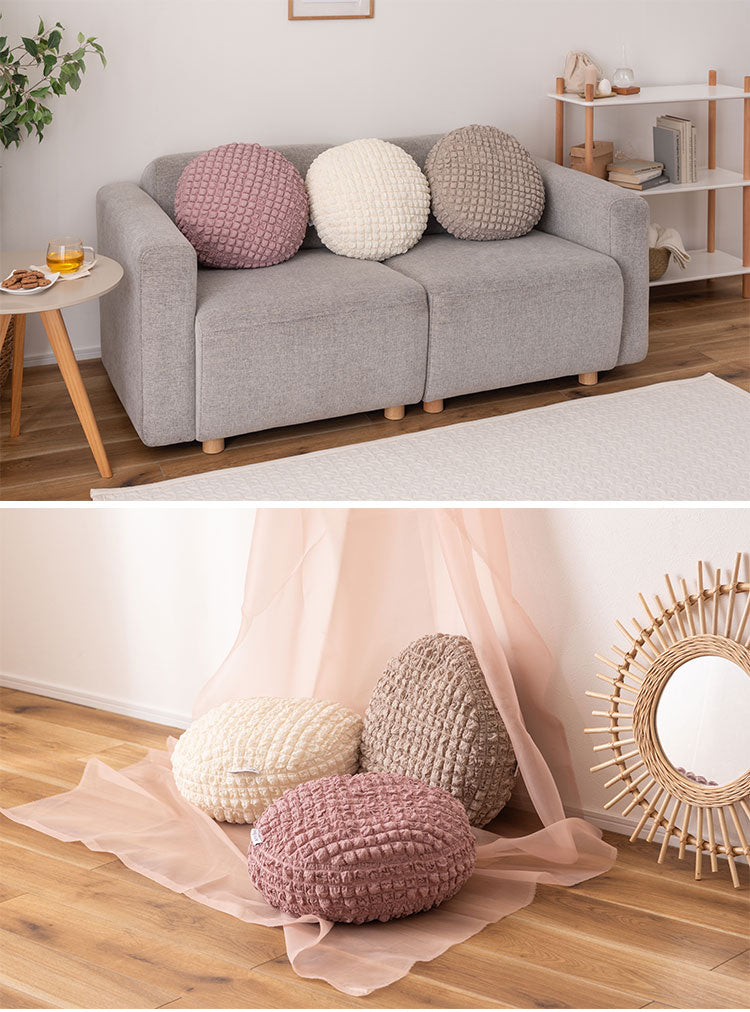 もちもち触感が気持ちいいラウンドクッション、中に入れる形状のフロアクッション、程よいクッション性でお部屋の主役になるラグマットの3アイテムでご用意しています。