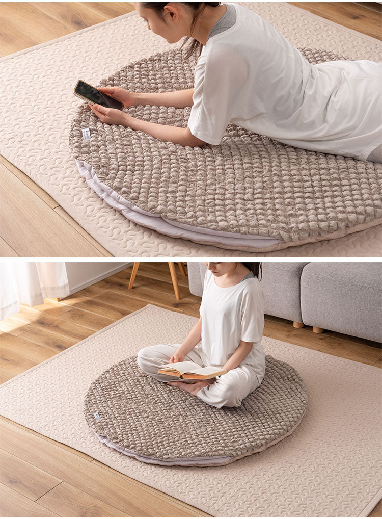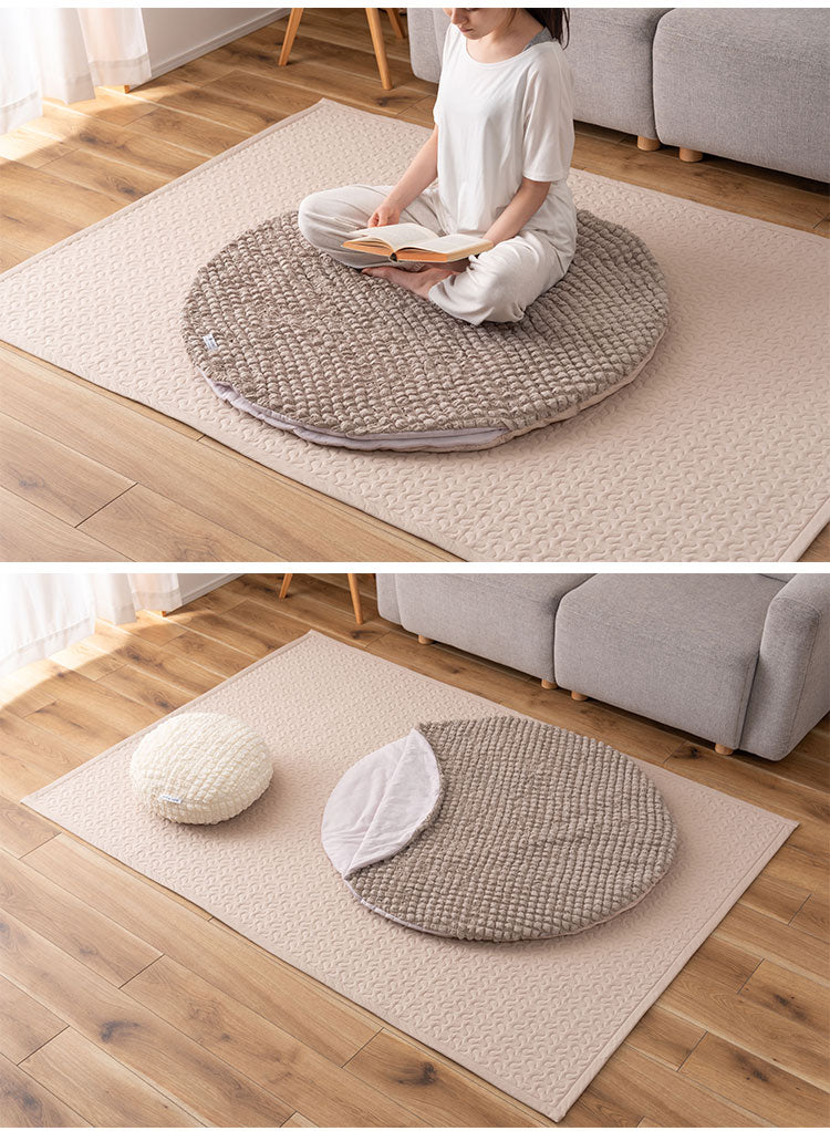 もちもち触感が気持ちいいラウンドクッション、中に入れる形状のフロアクッション、程よいクッション性でお部屋の主役になるラグマットの3アイテムでご用意しています。
