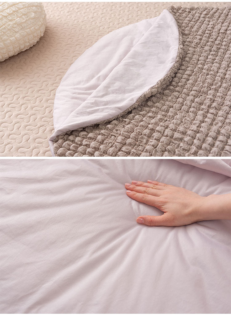 人気のポップコーン生地から接触冷感アイテムが誕生しました。冷感アイテムにはなかなか無いニュアンスカラーで、インテリアにも合わせやすいデザインにこだわりました。