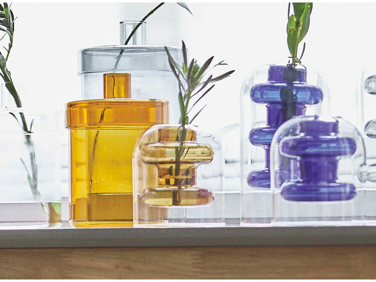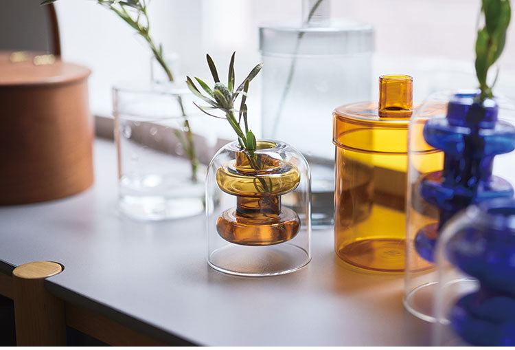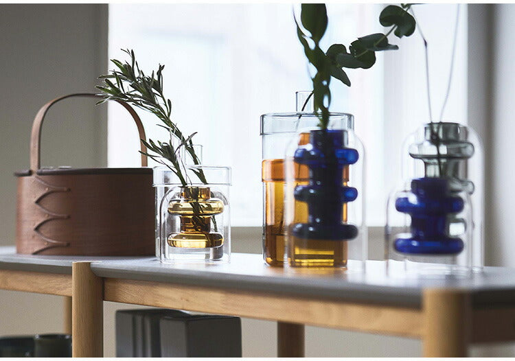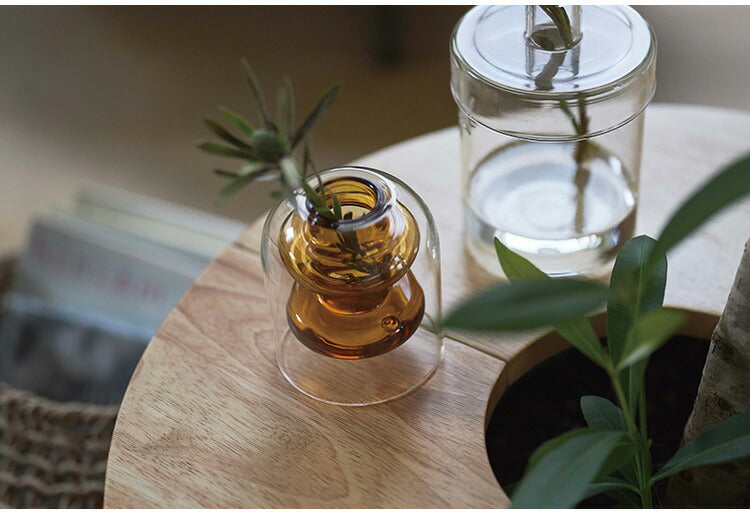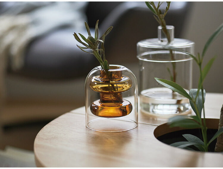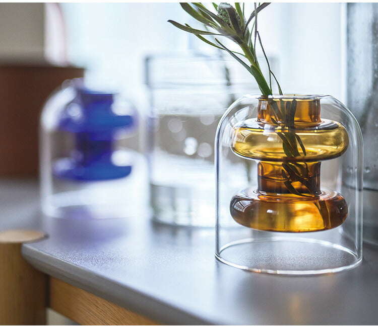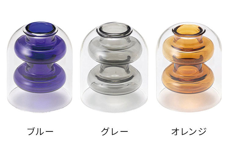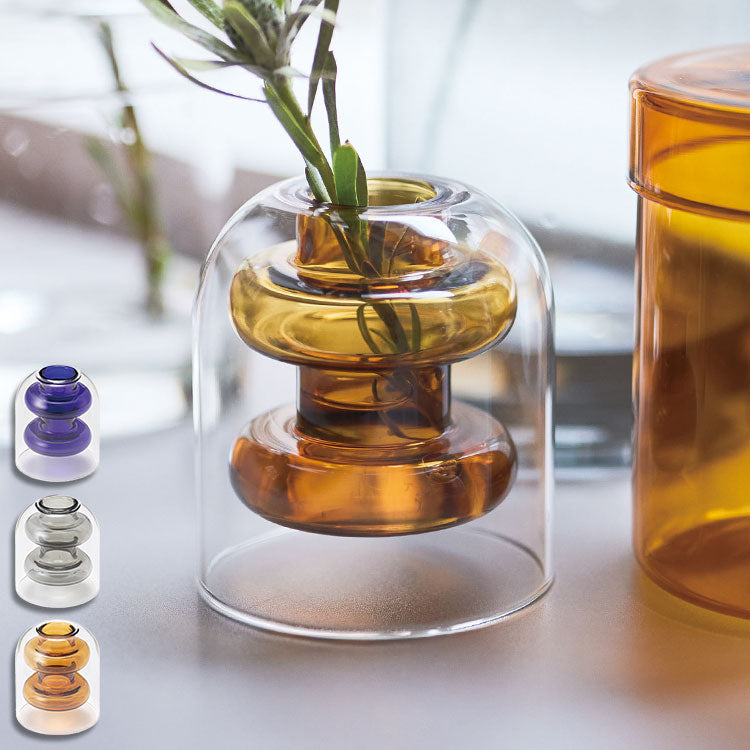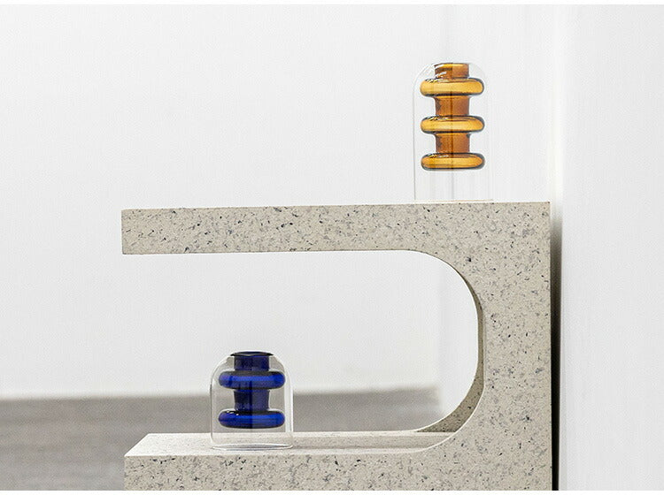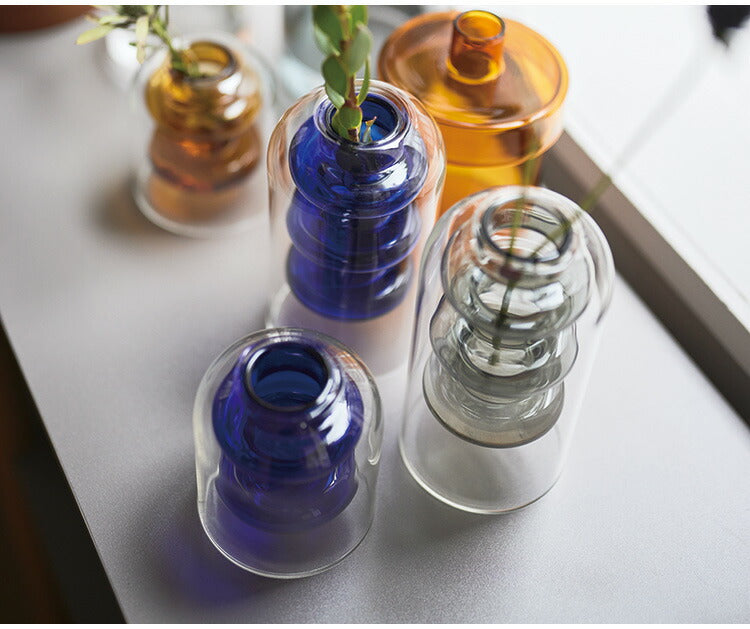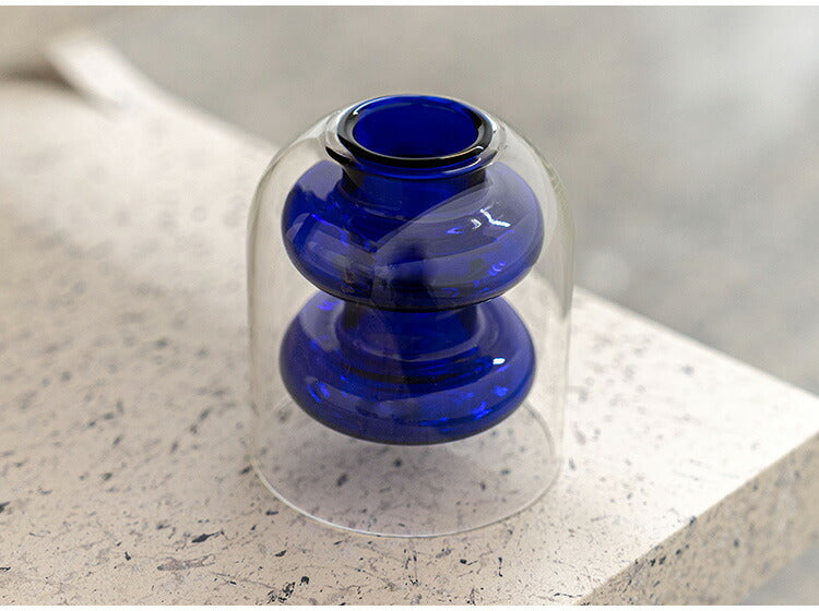 二重構造のユニークなフォルムが特徴的な一輪挿しタイプのガラスベース。