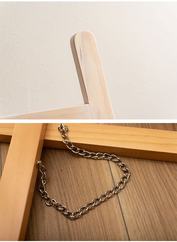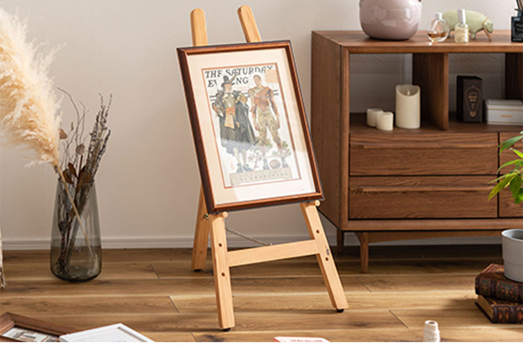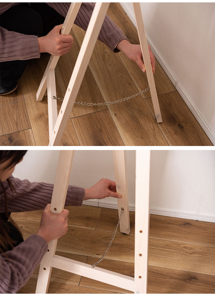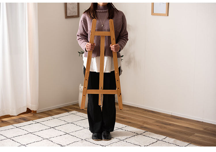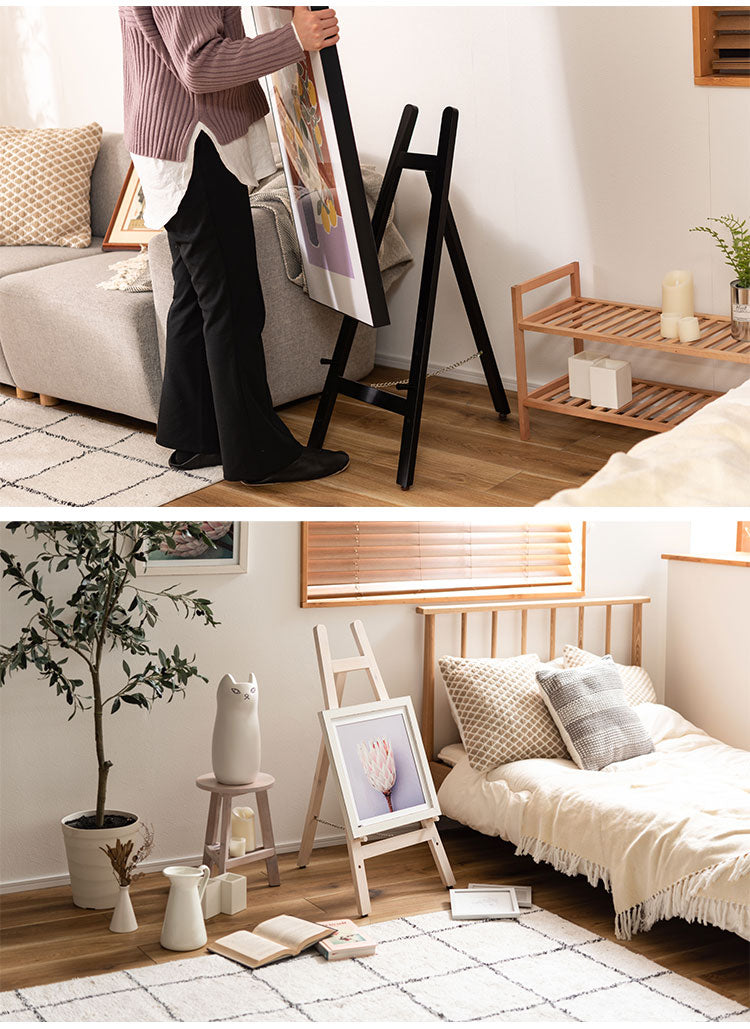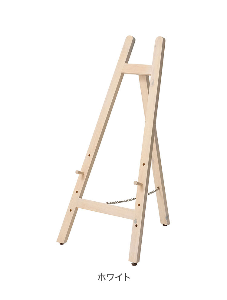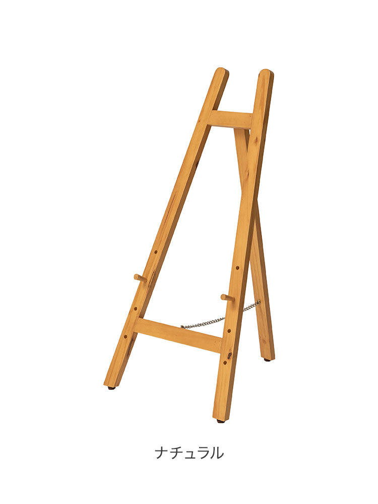 ●壁や床を傷つけずアートを手軽に飾れるイーゼル。●脚にはアジャスター付きで安定性抜群。●軽量&コンパクトなので移動や持ち運びもラクラク。●アートパネルを飾る高さは4段階の調節が可能。パネルフックははめ込み式なので簡単に調節できます。●後ろ脚を広げるだけで設置完了の簡単仕様。●前フレームと後ろ脚の間にチェーンが付いているので、脚が広がりすぎる事もなく安心。●アートパネルが引き立つ、天然木(パイン)のやさしい風合い。●3色展開でさまざまなテイストにマッチします。