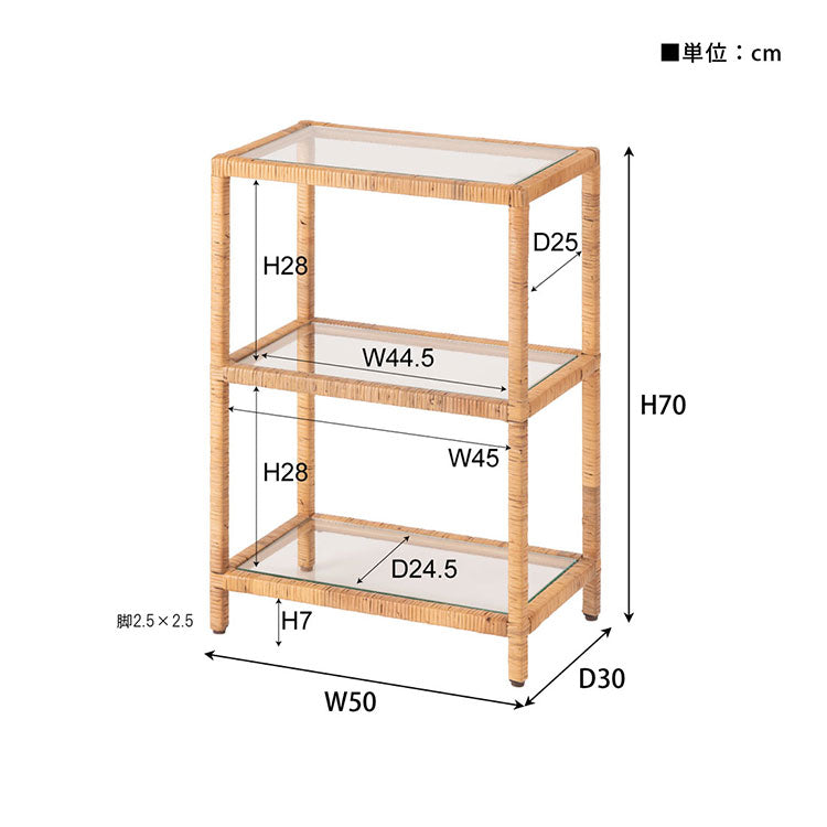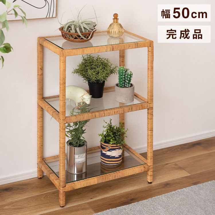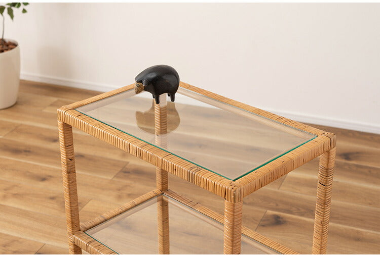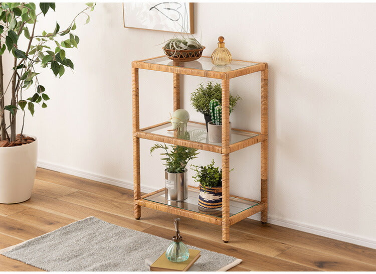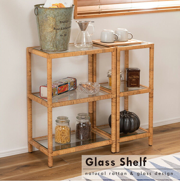 ガラスシェルフW GUY-2 東谷 シェルフ ガラス ガラスシェルフ ラタン 籐 クリア 収納 収納棚 ラック オープンラック 3段 三段 見せる収納 シンプル 北欧 ナチュラル ナイトテーブル 強化ガラス(代引不可)