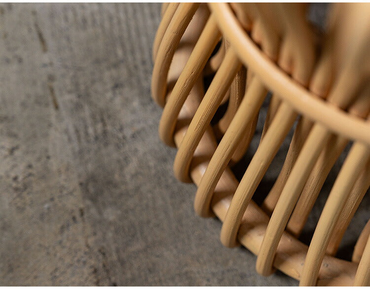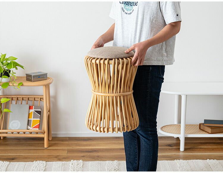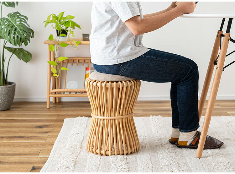鼓(つづみ)のようなフォルムが可愛いラウンドスツール、湾曲した広めの座面でゆったり座れるラタンスツール、マガジンラック付きサイドテーブルの3アイテムがラインナップしています。