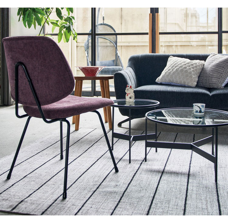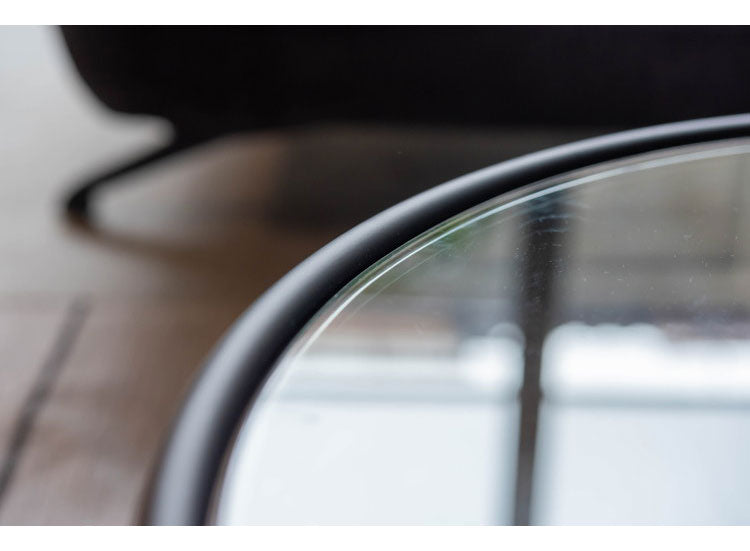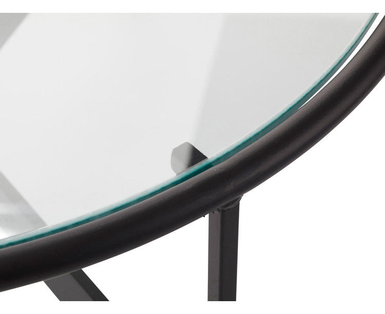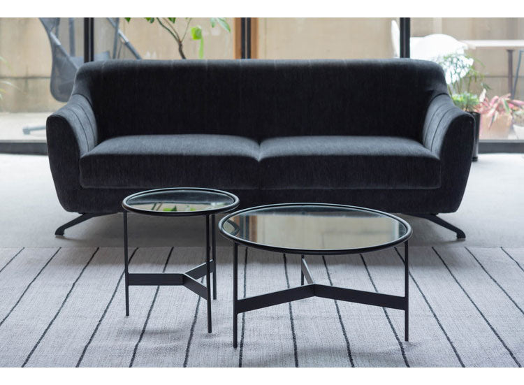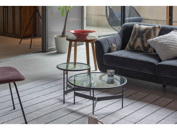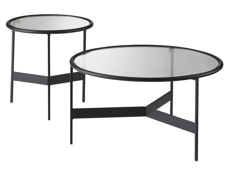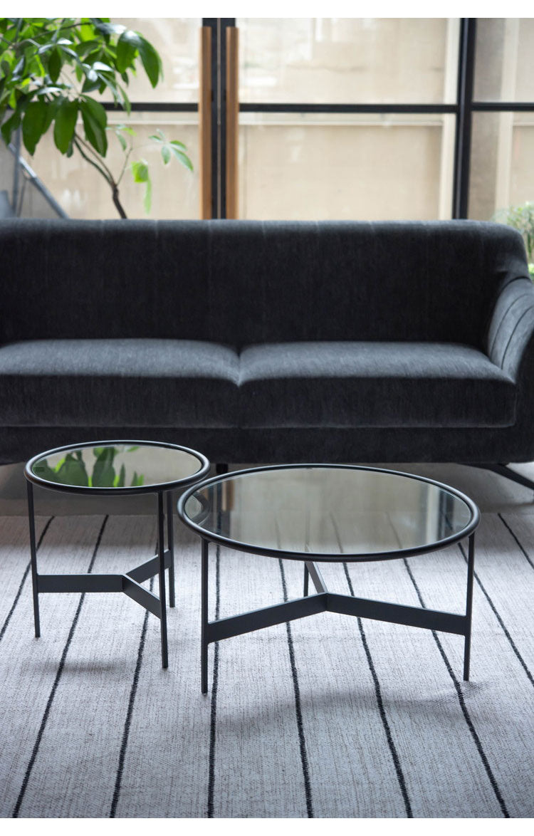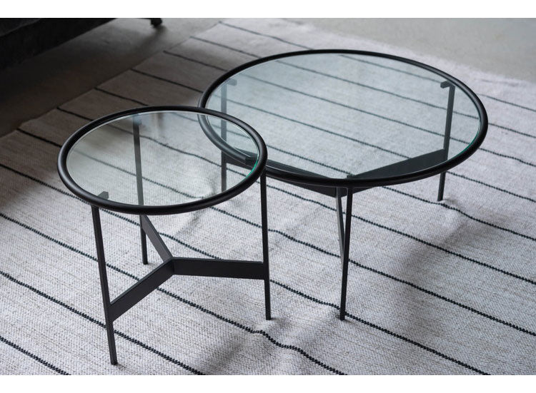マットなブラックアイアンの滑らかな曲線とハードなガラスを組み合わせた2サイズのローテーブル。