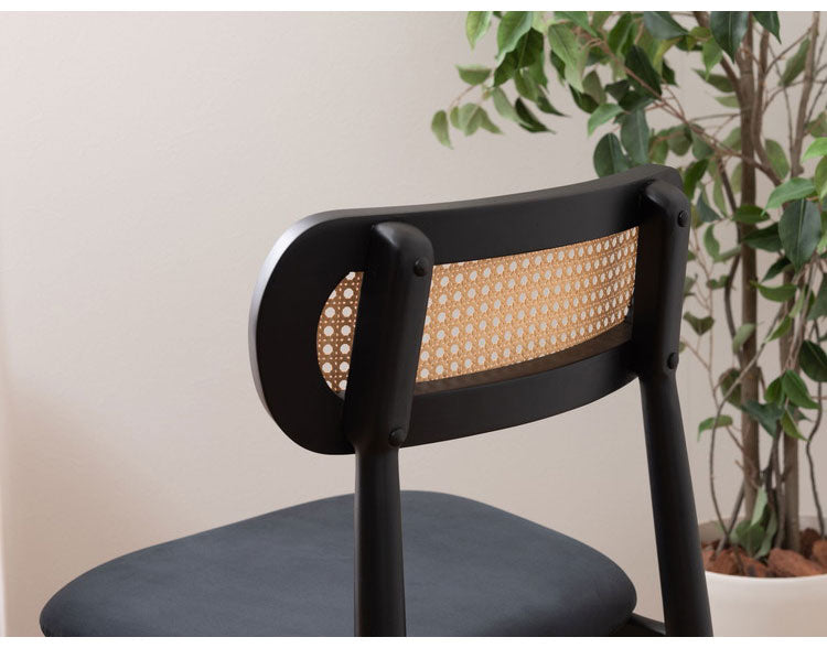 高級感のあるスエード調の座面×天然木×ポリプロピレン素材の人口ラタンが優しい雰囲気を作り出してくれるチェア。