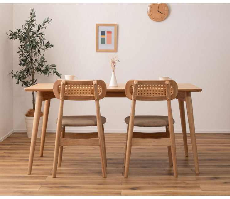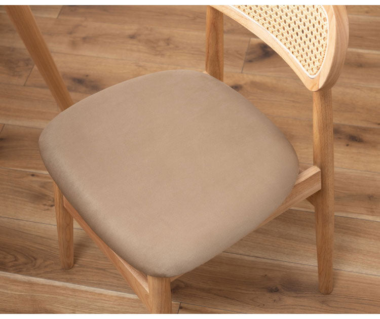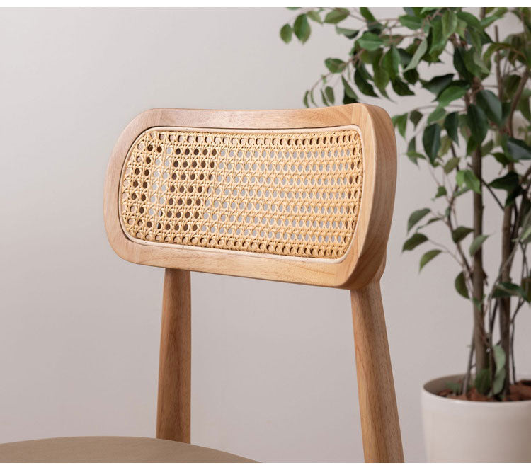 高級感のあるスエード調の座面×天然木×ポリプロピレン素材の人口ラタンが優しい雰囲気を作り出してくれるチェア。