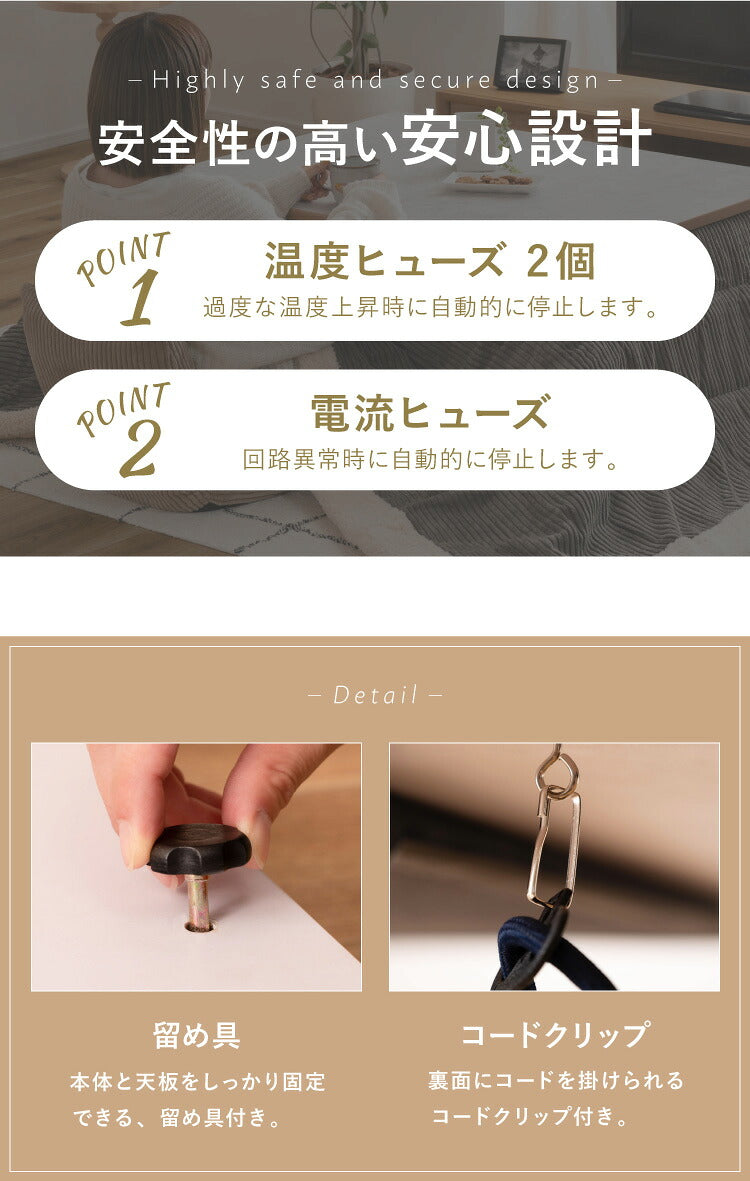 大理石調のストーン柄の天板とナチュラルな木目の組み合わせ。すっきりとしたデザインとこだわりの機能を兼ね備えた自慢のこたつです。