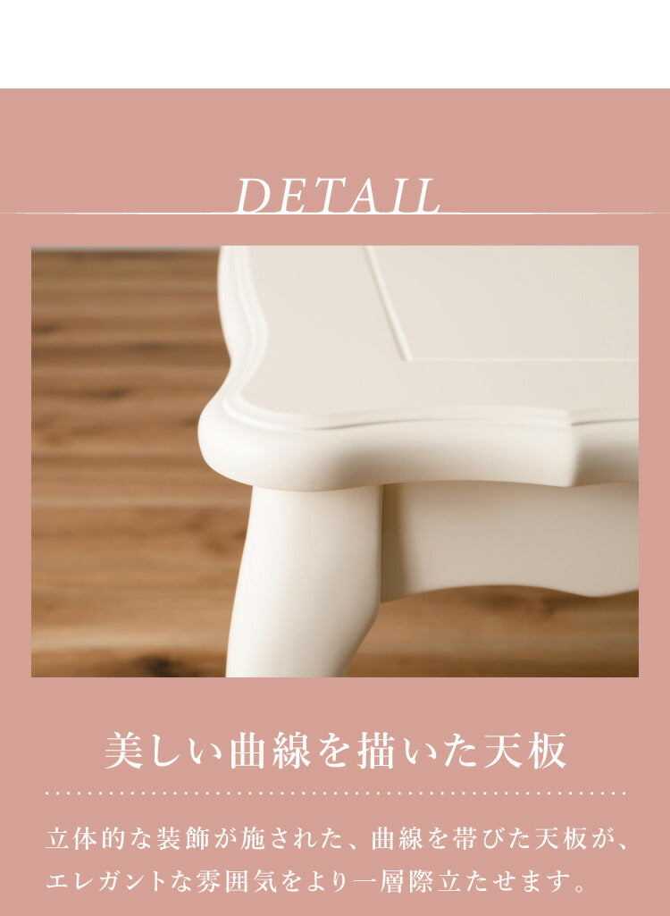 天板の装飾や猫脚のクラシカルなデザインはシーズン選ばずお使い頂けます。ホワイトカラーと天板のデザインは、布団を掛けても元々のイメージはそのままに、クラシカルでガーリーな雰囲気を演出してくれます。