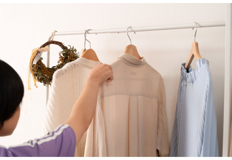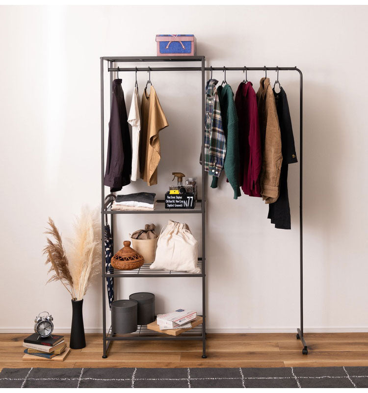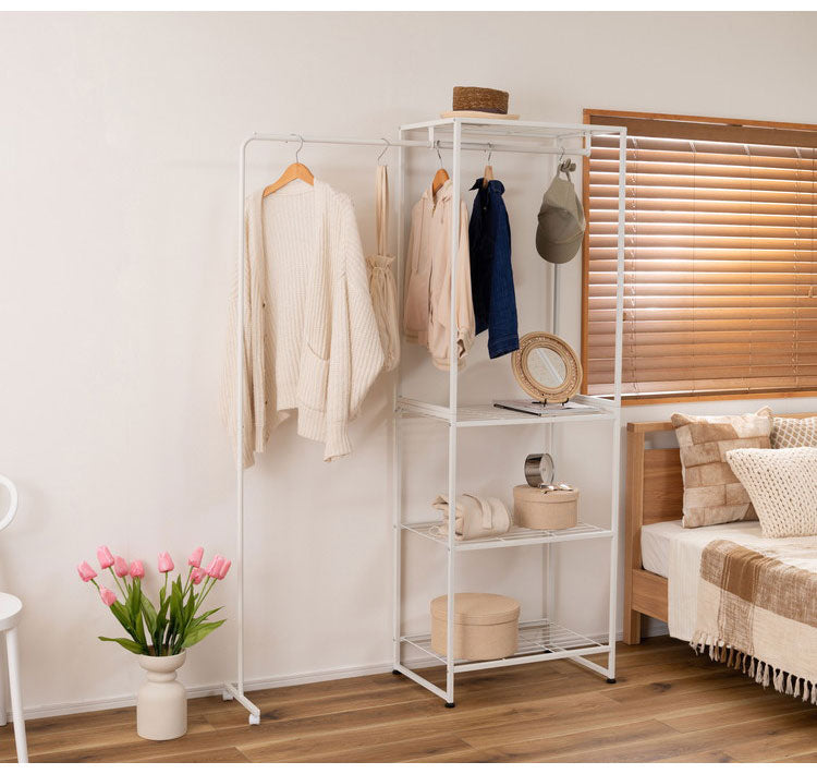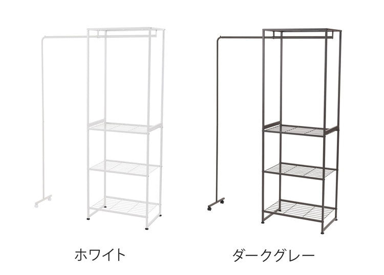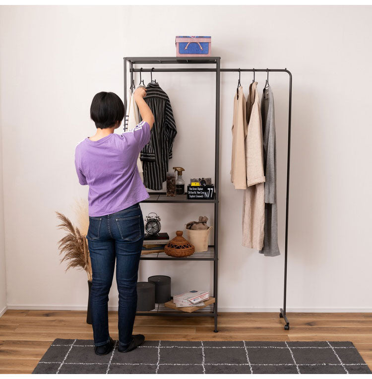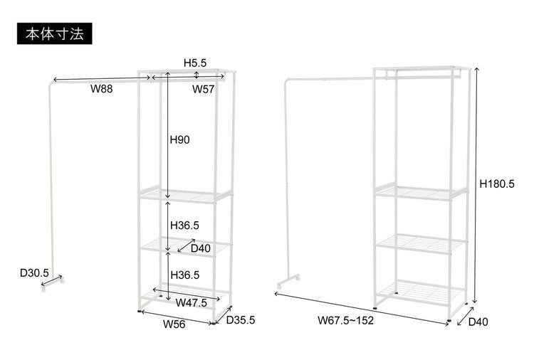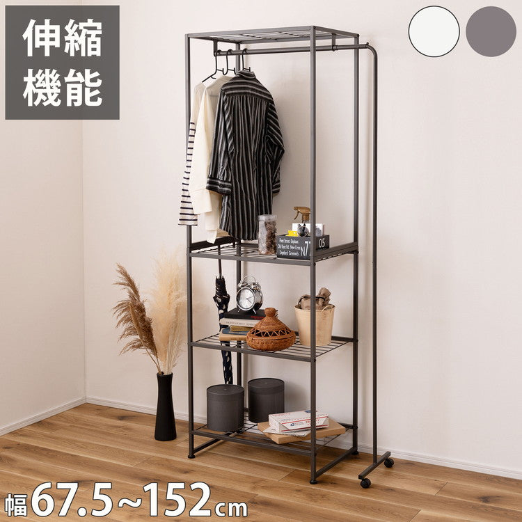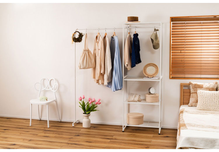 ●シンプルで、置く場所を選ばないスチール製のラック。伸縮機能が付いたハンガーが付いており、衣類を掛ける量やお部屋の広さに合わせて、ハンガーの幅を調整する事が出来ます。