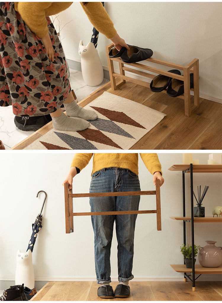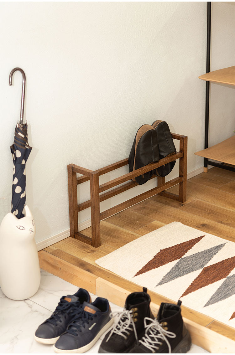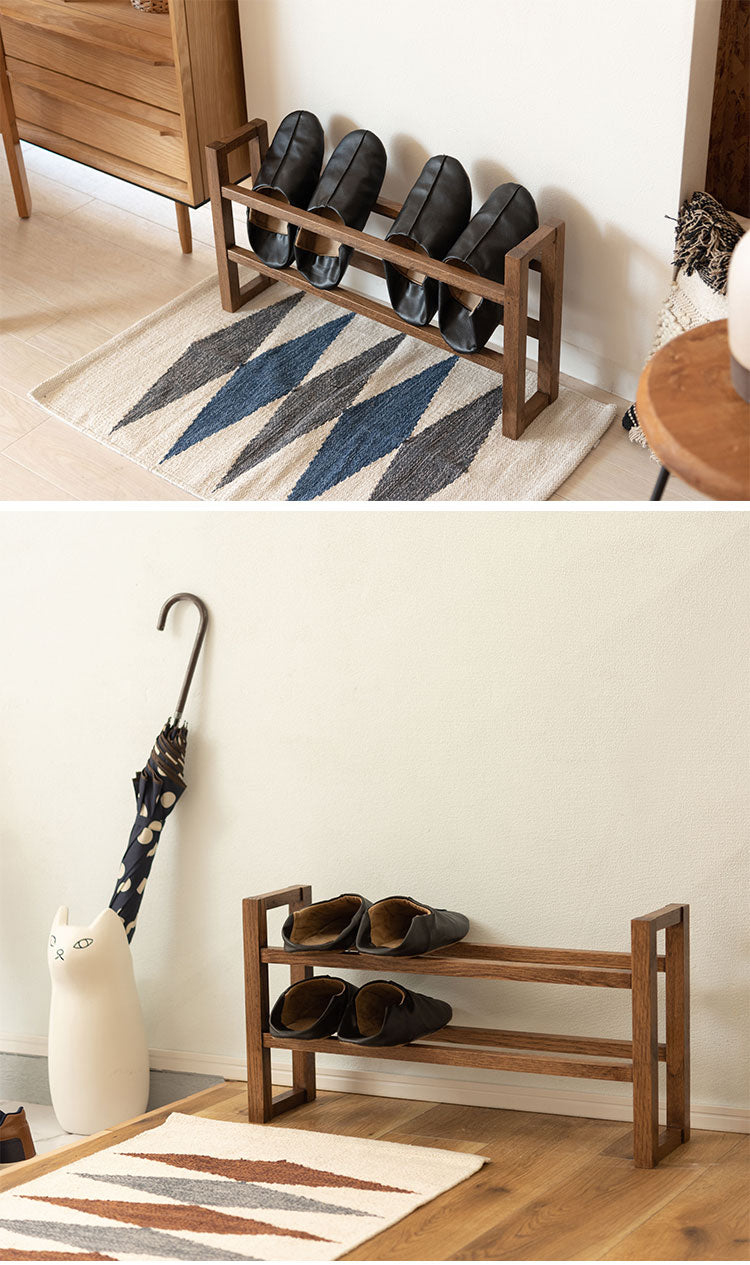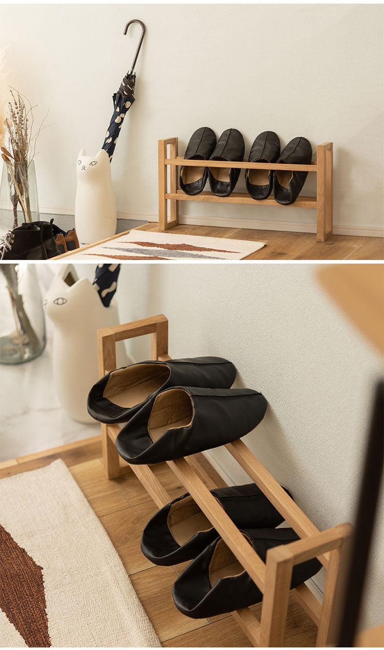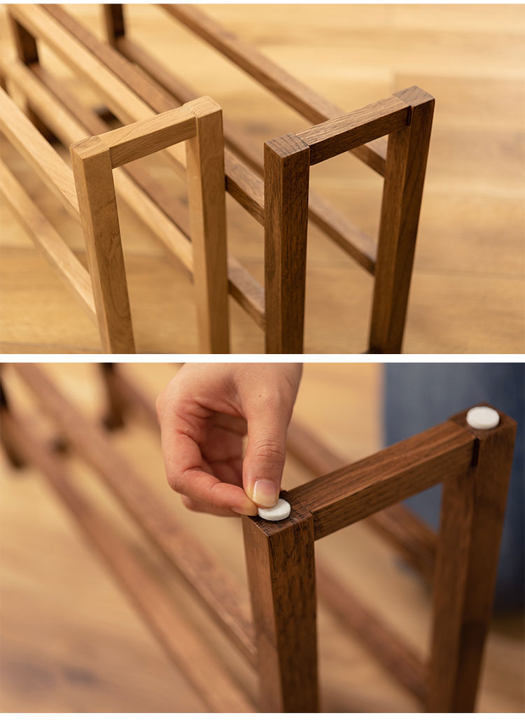 ●耐久性があり高級木材の一つとされる、美しく個性的な雰囲気を持つ天然木(オーク)の無垢材を使用したスリッパラック。●スリッパは横置きでも縦置きでも最大4足まで収納が可能。●また、すっきりとしたスリムサイズなので狭いエントランスや玄関スペースに最適なサイズ。●軽くて持ちやすい仕様なので移動も簡単。●床への傷防止フェルトが付いているので安心です。