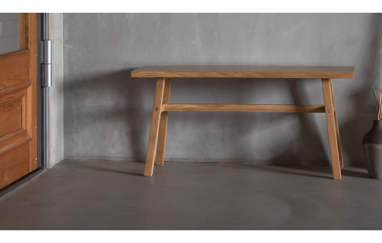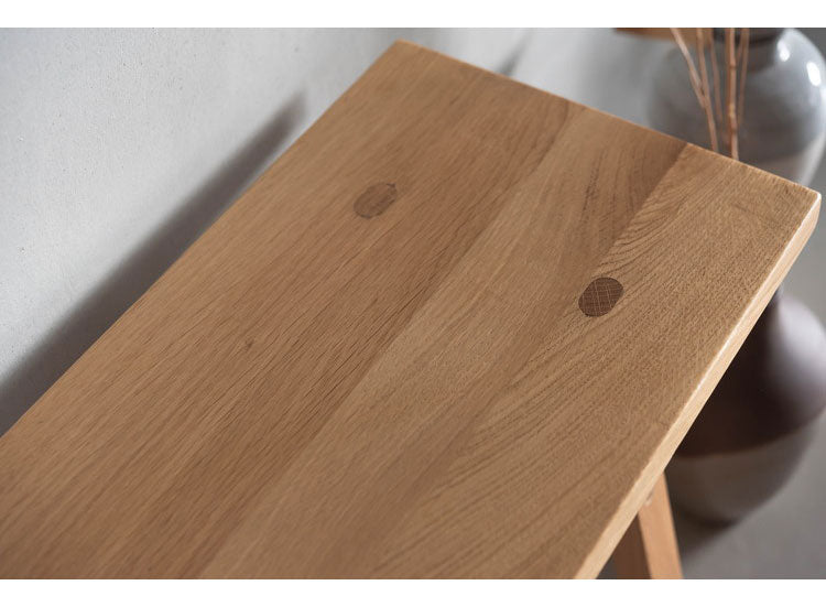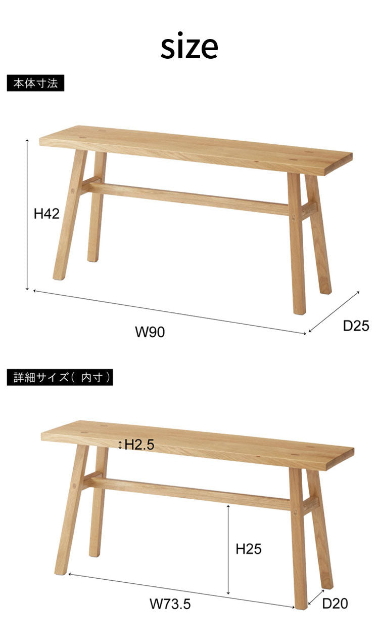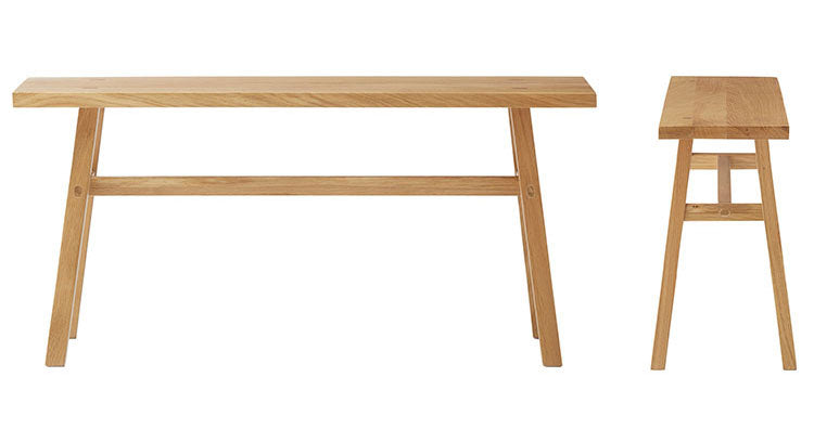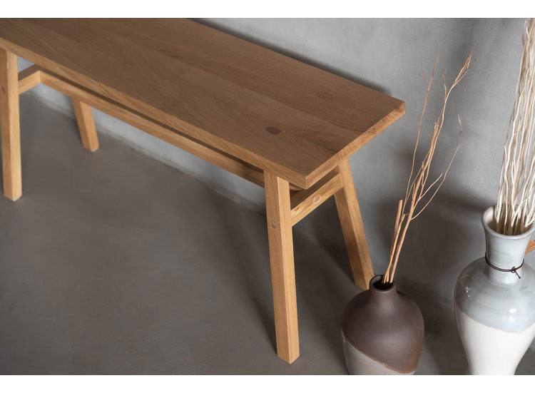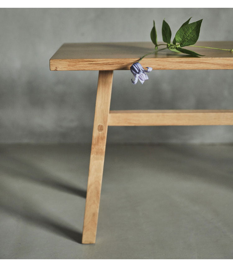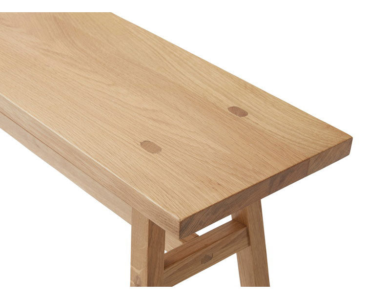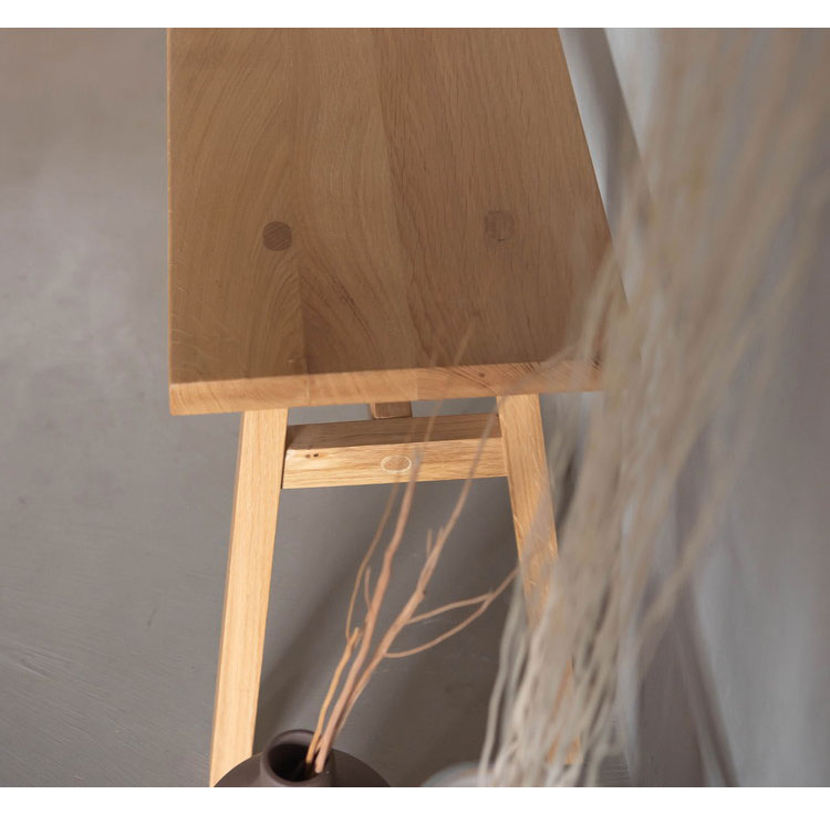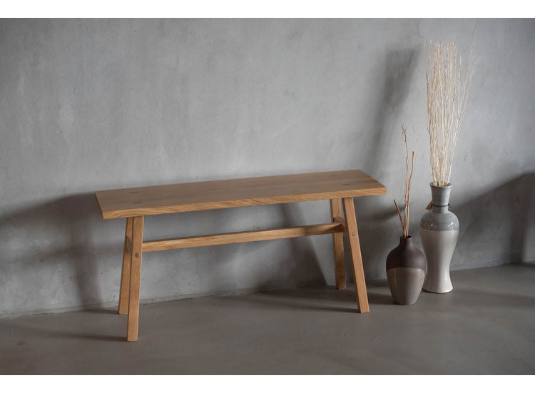 ホワイトオークの素材感を感じられる、シンプルなデザインのウッドベンチ。