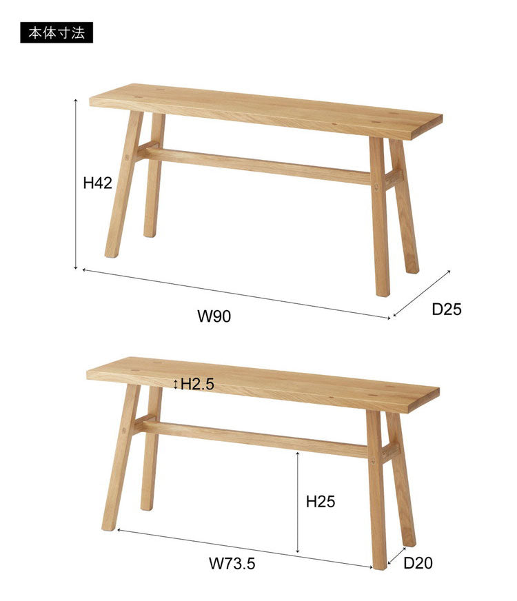 ●天然木オークの無垢材を贅沢に使用した、シンプルなデザインのウッドベンチ。
