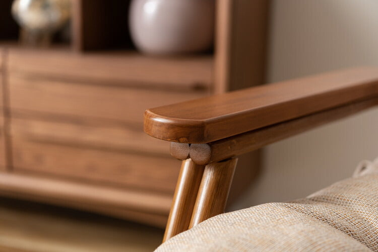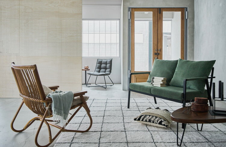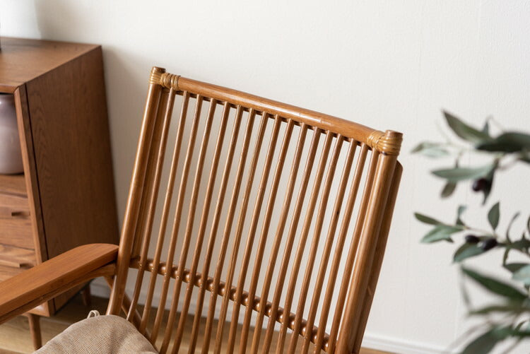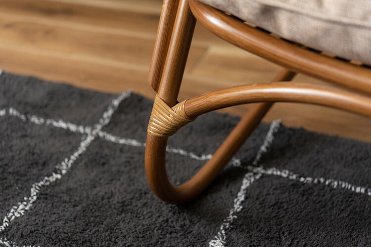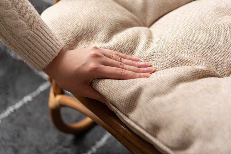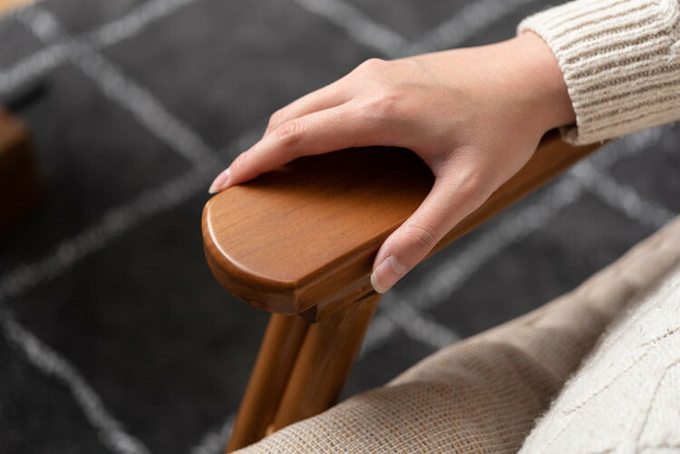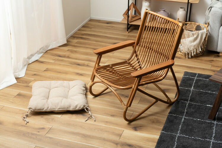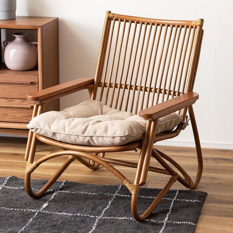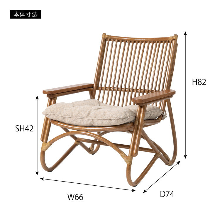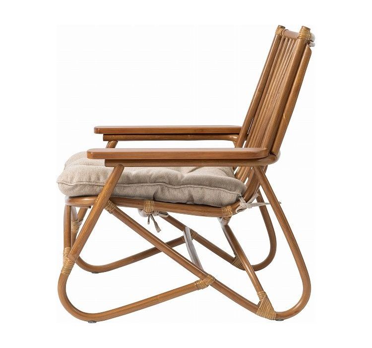 ●脚のカーブが美しい、天然木×ラタンのパーソナルチェア。●ゆったりと座りやすい形状と、印象的なデザインが特徴です。●肘掛けには天然木(チーク)を使用。天然木のぬくもりがしっかりと手に馴染みます。●ラタン(籐)ならではの、しなやかで柔らかい曲線も魅力の一つです。●背もたれには緩いカーブを掛けているので、ゆったりとくつろぐことができます。●ほどよいクッション性のある座面クッションは取り外しが可能です。