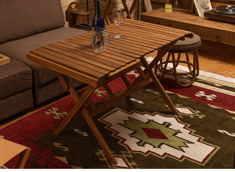 アウトドアやテラスなど様々なシーンで活躍するロールトップテーブル。工具不要で分解ができるので、持ち運びや収納にも便利です。