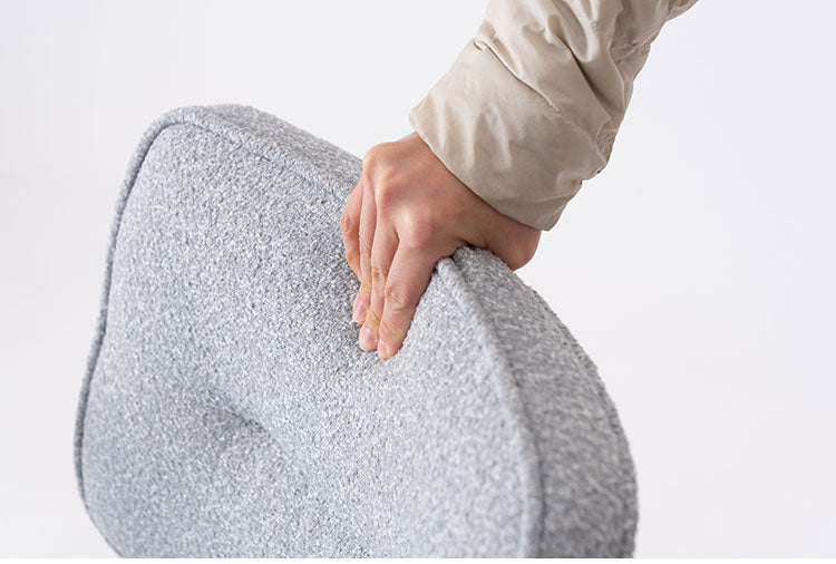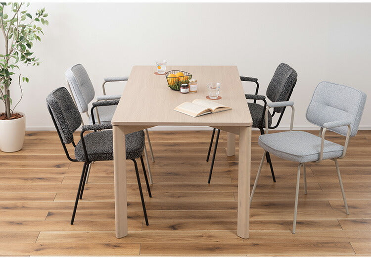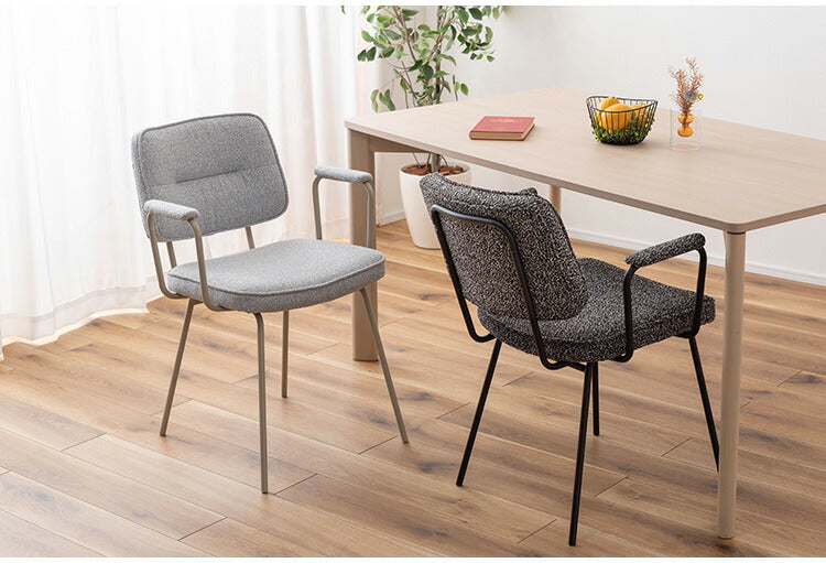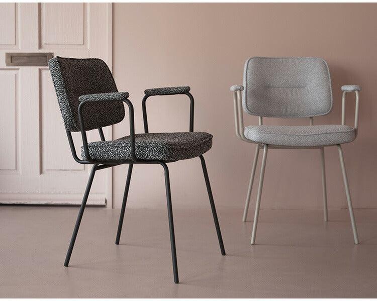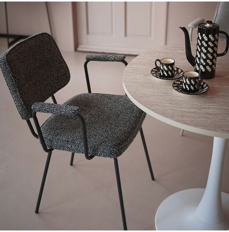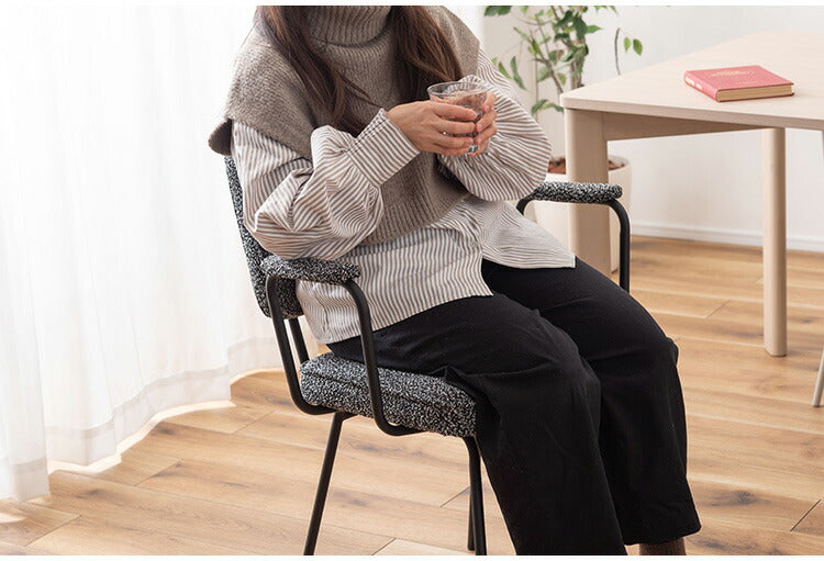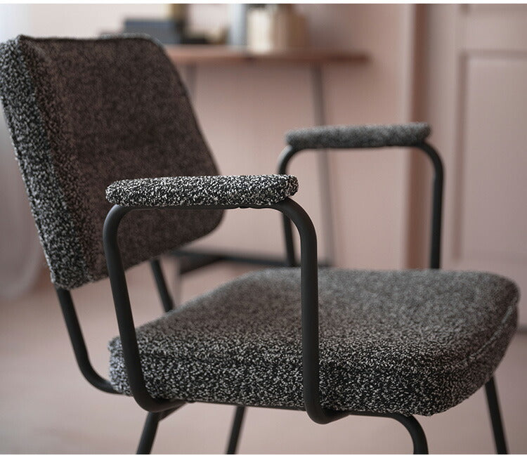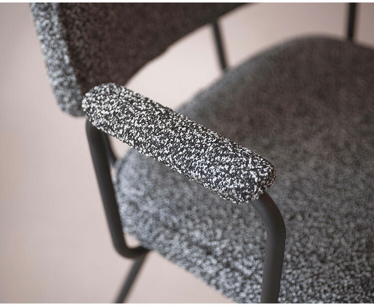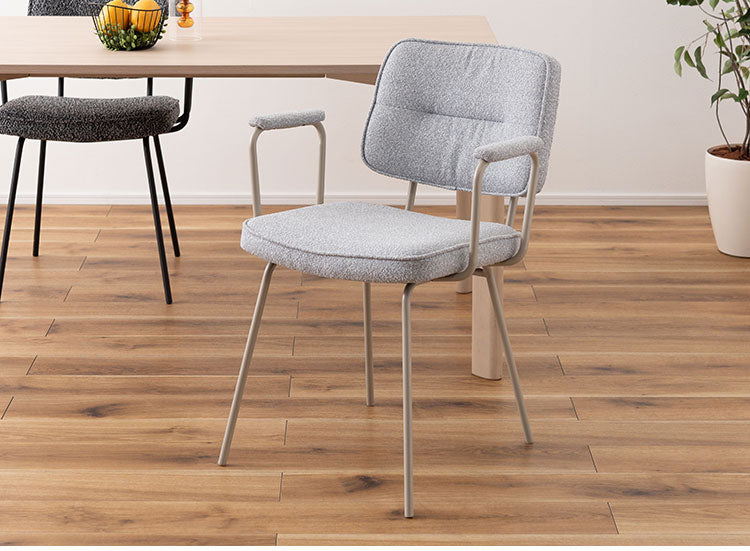 アーム部分に特徴的なデザインを施したチェア。ファブリックには混色のブークレ生地を使用し、表情のあるデザインに仕上げました。デザイン性と使いやすさ、快適さを兼ね備えたアイテムです。