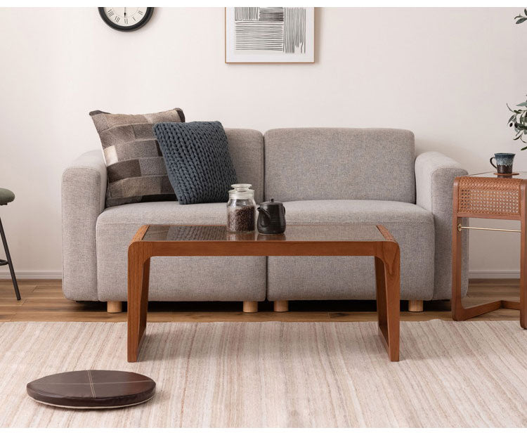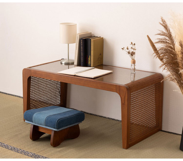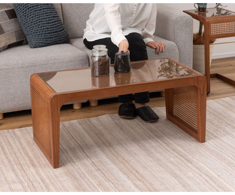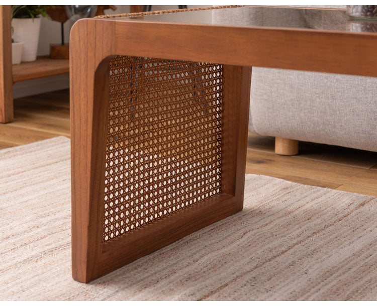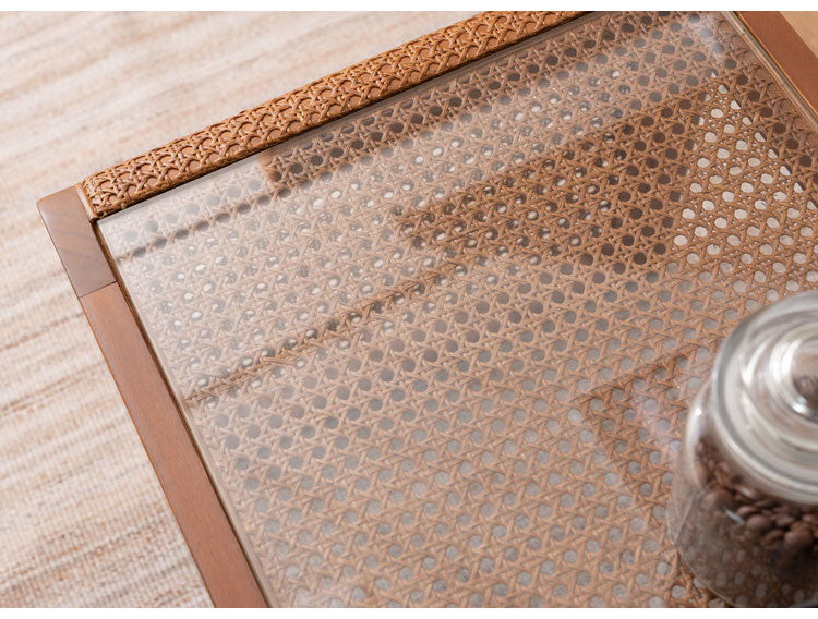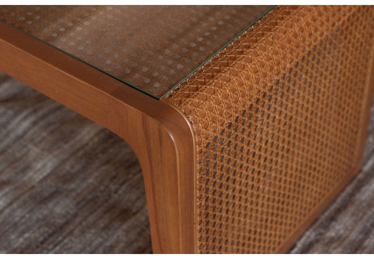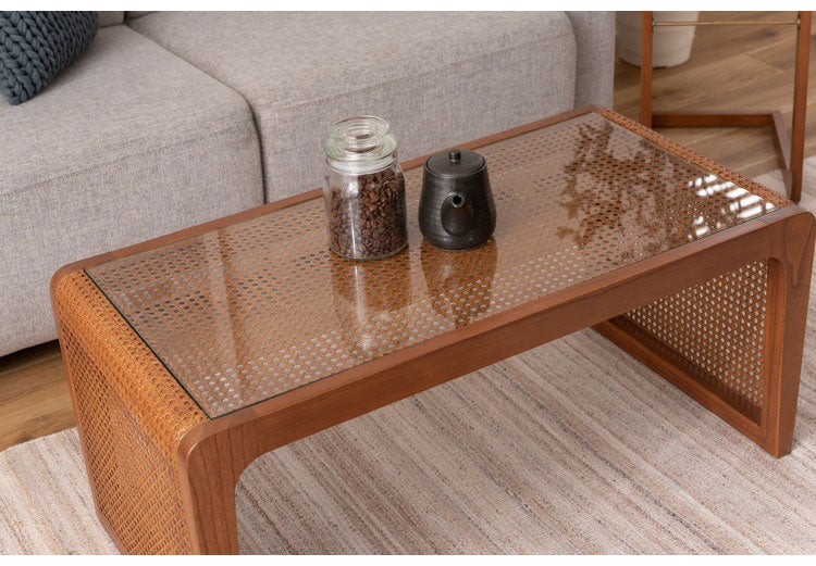 天然木(ミンディ)、ラタン、ラッカー塗装、5mm強化ガラス