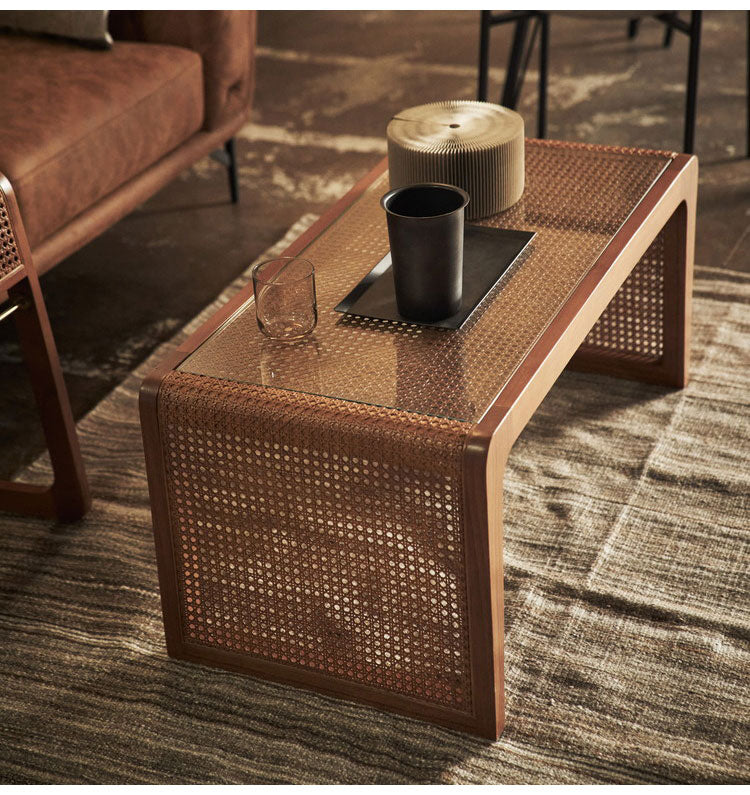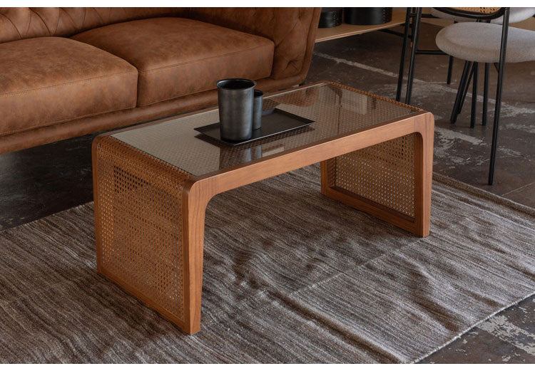 天然ラタンで編まれたメッシュを全体にあしらったガラステーブルシリーズ。カゴメ格子という伝統的な編み方は程よい抜け感と軽量な設計も魅力です。落ち着いた印象のブラウンカラーは様々なシーンによく合います。
