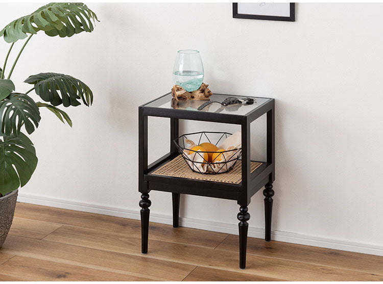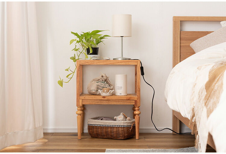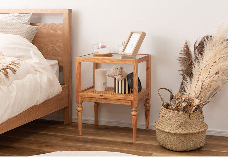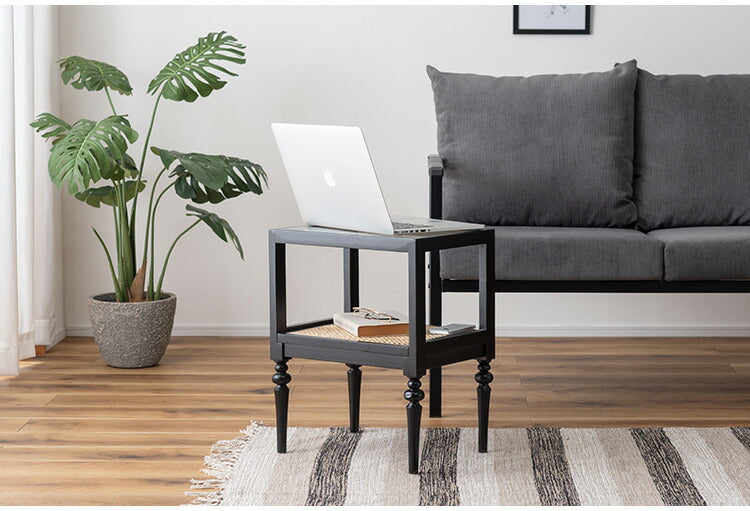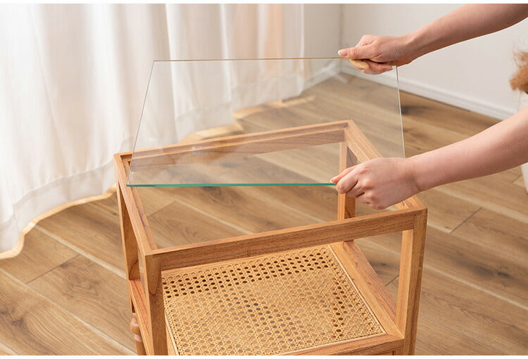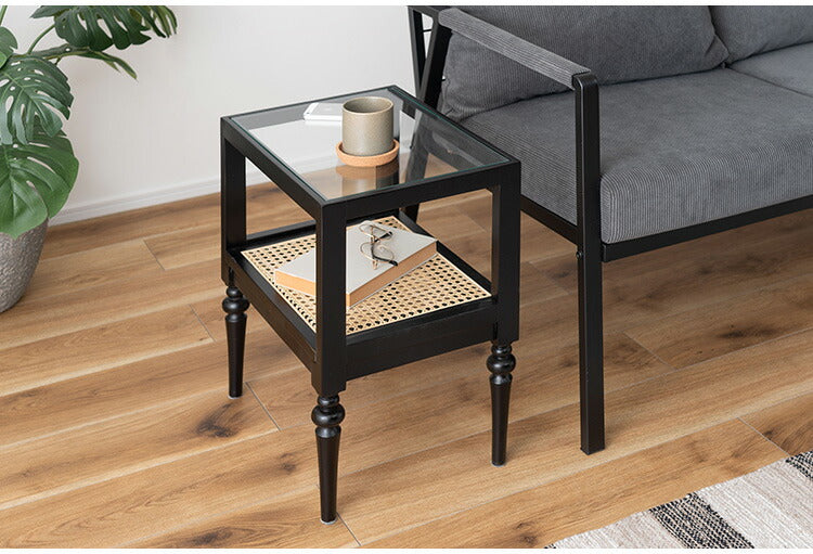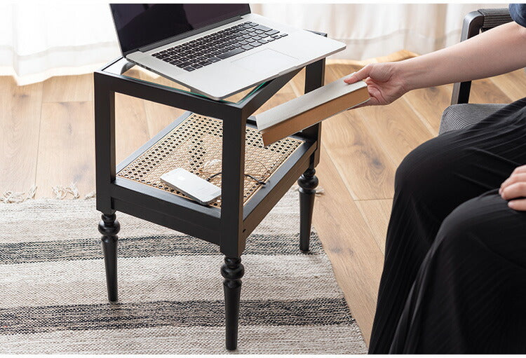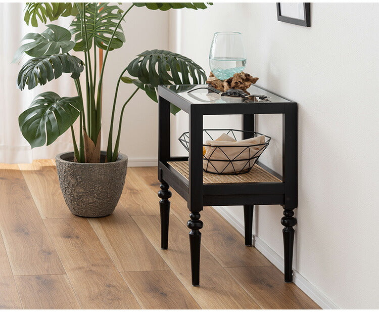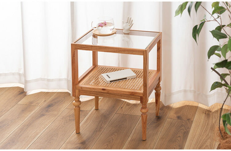 天然木とラタンを使用したナチュラルなイメージのデザインながら、ターンドレッグ(ろくろ脚)を採用することで、クラシカルな雰囲気も感じられるオープンシェルフ&サイドテーブル。ガラス天板で抜け感もあり、使いやすいサイズ感も魅力です。