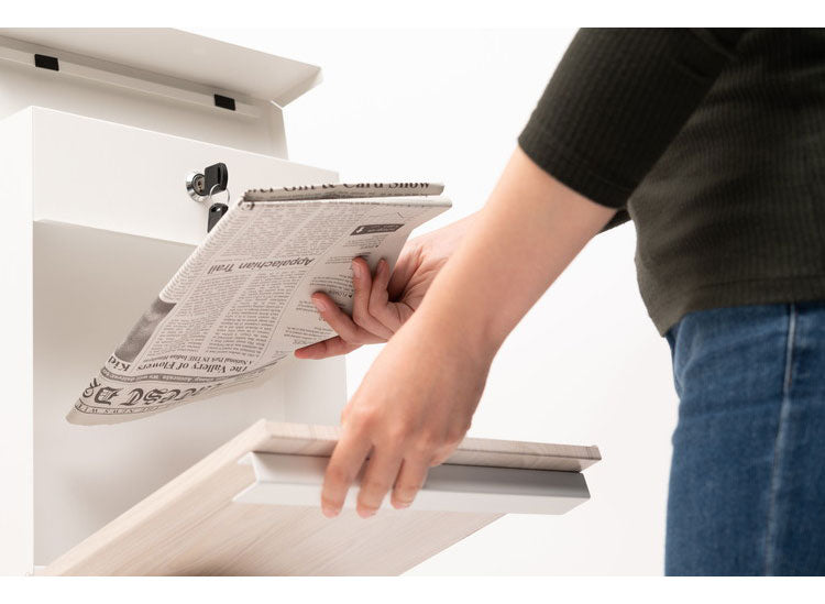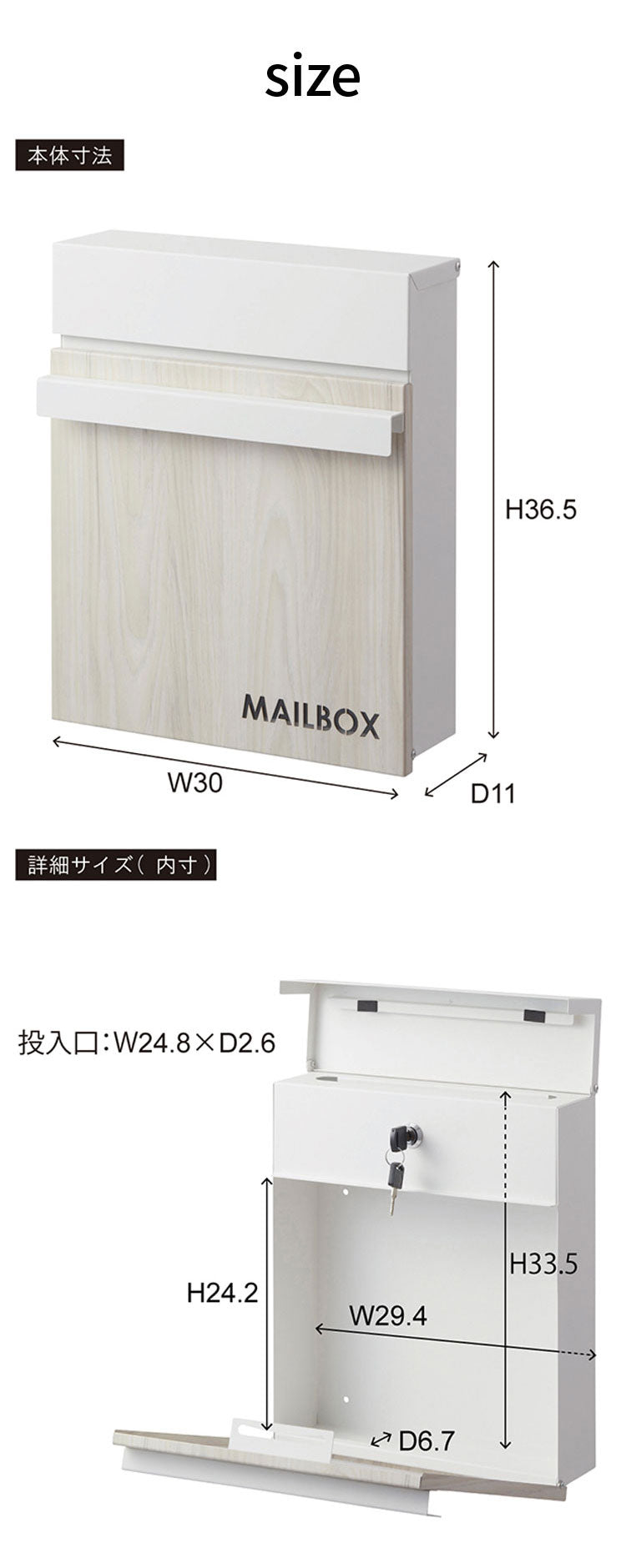 無駄をそぎ落としたシンプルデザインのメールボックス。鍵穴も目立たないようにした構造となっておりスタイリッシュに仕上がっております。本体のMAILBOXの文字は窓型になっており、中の郵便物をわざわざ開けずに確認ができます。