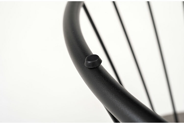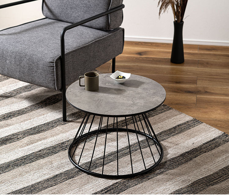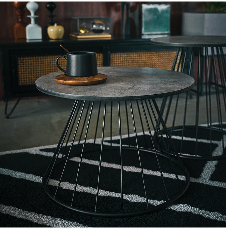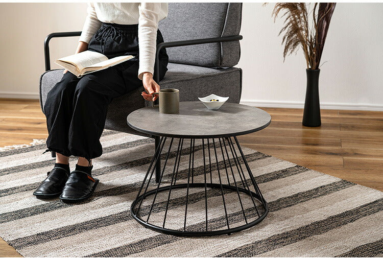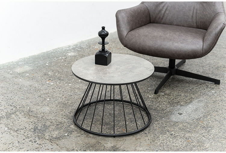 中央に向かって伸びる細いブラックスチールの脚部が特徴的なラウンドテーブル。