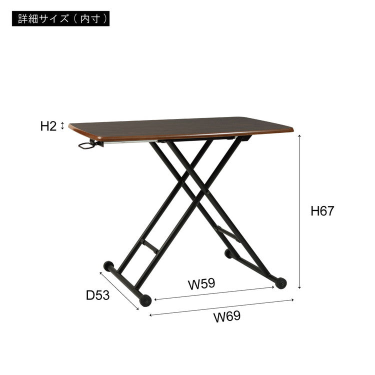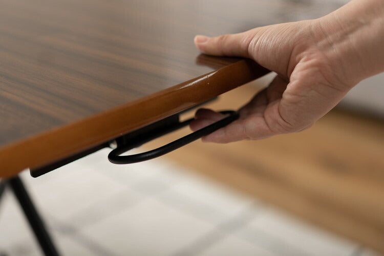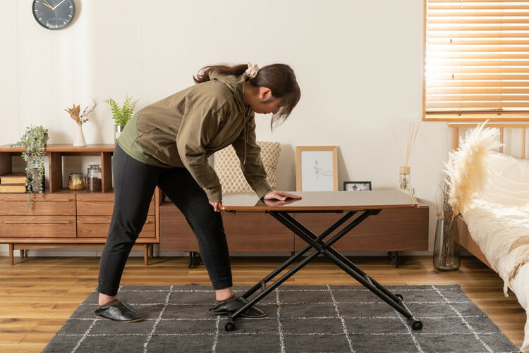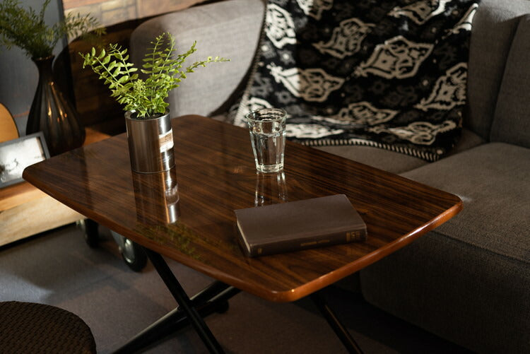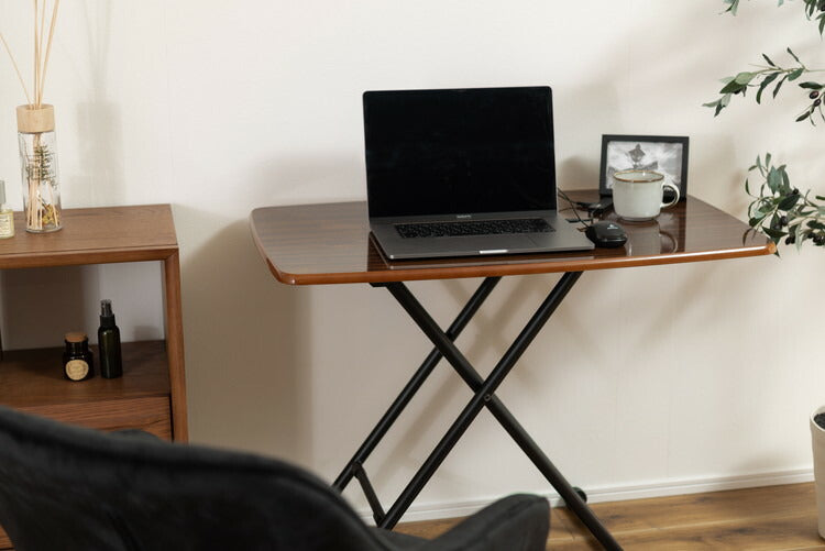 ●シンプルで丸みのあるやわらかなラインや、少しレトロを感じさせる光沢のある天板が特徴のミッドセンチュリーを感じさせる昇降テーブル。●天板は綺麗な木目調のプリント化粧繊維板にポリエステル塗装を施した、高級感のある鏡面仕上げ。●水に強い仕様なので、汚れ等も拭き取りやすくお手入れも簡単。●天板サイド部分に付いているレバーを引きながら高さ調整が可能。●高さは約11.5~70cmまで様々な高さに調節が可能。●リビングテーブルとしてや、ソファに座りながらのソファ用テーブルとして、またチェアに座ってデスクとして時々のシーンに合わせて使えます。●天板サイズは幅90×奥行55cmとワークスペースに十分なサイズ。リモートワークにも最適です。●テーブルの角を丸く面取り加工をしているので安心。●折りたたみ時は厚さ約11.5cmと薄くなるので、ソファの下やクローゼットの隙間に収納が可能です。